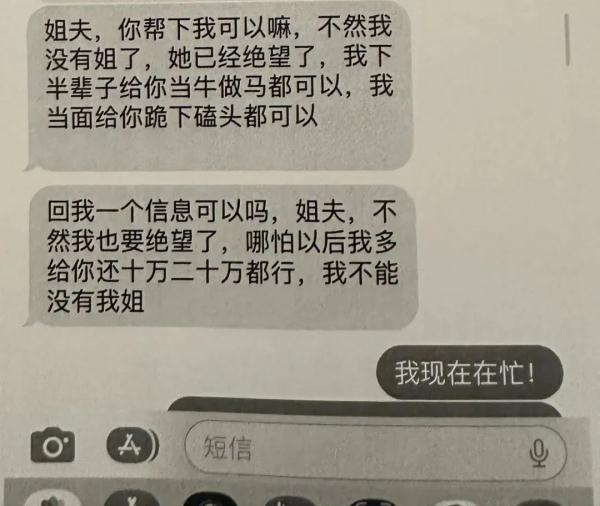 “姐夫,我是小穎的弟弟小程,你幫幫我姐吧,她就要自殺了!”8月31日,一段來自“小穎弟弟”的短信讓汪先生的心提了起來。汪先生立刻回電話過去,小程說姐姐發來了一段微信留言,讓自己保重,之后自己就再也聯系不上姐姐了。
