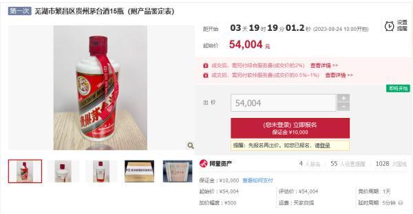 其中,15瓶茅臺酒起拍價:54,004元(大寫:人民幣伍萬肆仟零肆元整),交易保證金:10,000元(大寫:人民幣壹萬元整),加價幅度:500元(大寫:人民幣伍佰元整)或整倍數。