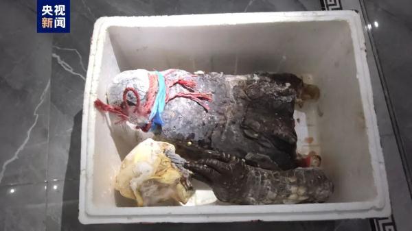另外1條鱷魚,經公安部門調查得知,于2021年12月27日,被該養殖場員工發現精神狀態不佳(臨近死亡)后,被該養殖場員工宰殺,并將部分鱷魚肉出售,鱷魚頭被冰凍保存。公安部門已提取到宰殺鱷魚當晚的相關微信對話記錄,及現場宰殺鱷魚的視頻錄像等證據進行保存,并到該員工家中取走鱷魚頭和部分鱷魚腳等部位的凍體進行封存取證。