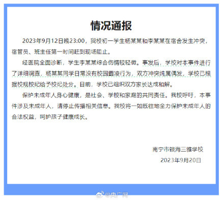 近日,網(wǎng)傳廣西南寧一所初中女生在學校宿舍遭受霸凌,數(shù)十位家長聯(lián)名要求勸退霸凌學生一事,引發(fā)廣泛關(guān)注。9月20日,南寧市銀海三雅學校官網(wǎng)發(fā)布情況通報稱:9月12日晚,該校初一學生楊某某和李某某在宿舍發(fā)生沖突,宿管員、班主任第一時間趕到現(xiàn)場阻止。經(jīng)醫(yī)院全面診斷,學生李某某綜合傷情較輕微。事發(fā)后,學校對本事件進行了詳細調(diào)查,楊某某同學日常沒有校園霸凌行為,雙方?jīng)_突純屬偶發(fā),學校已根據(jù)校規(guī)校紀給予處分。目前,學校已組織雙方家長達成和解。