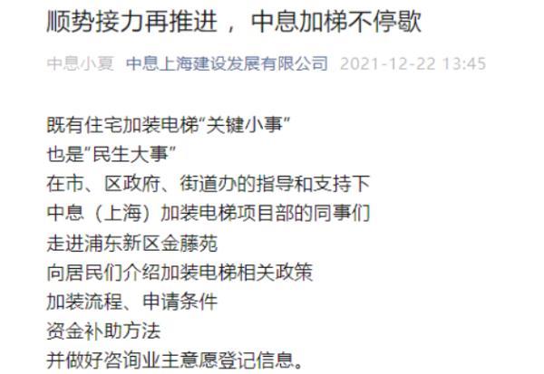 王芹否認了街道推薦加梯代建公司的說法,表示是對方自薦。但有一件事不可否認,那就是根據(jù)居民口述以及中息(上海)建設發(fā)展有限公司公眾號內容,該公司曾進入過浦興路街道內的小區(qū)進行擺攤宣傳。