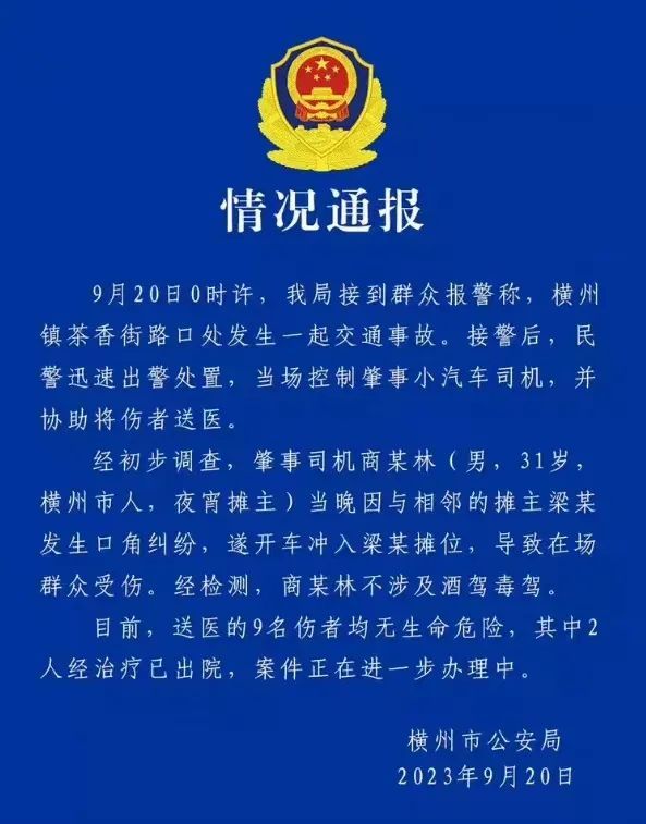 9月20日,廣西南寧橫州市公安局發布情況通報稱,9月20日0時許,該局接到群眾報警稱,橫州鎮茶香街路口處發生一起交通事故。接警后,民警迅速出警處置,當場控制肇事小汽車司機,并協助將傷者送醫。