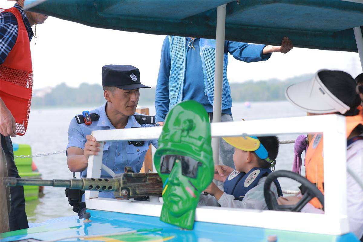 節(jié)日期間,后官湖濕地公園警務(wù)室安排一名民警和一名輔警駐點(diǎn)辦公,處理矛盾糾紛,接受游客求助。9月29日上午,民警王文超、輔警李秀成在景區(qū)巡邏,提醒游客劃船時(shí)穿好救生衣。