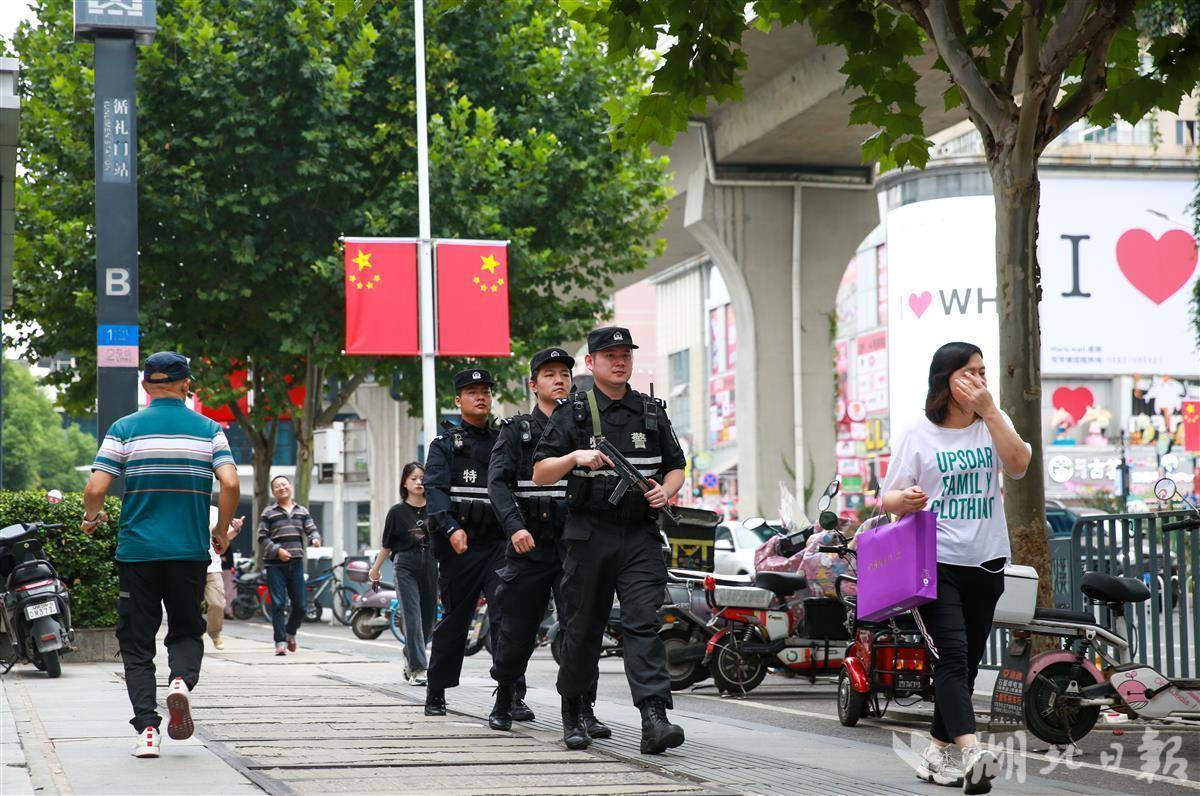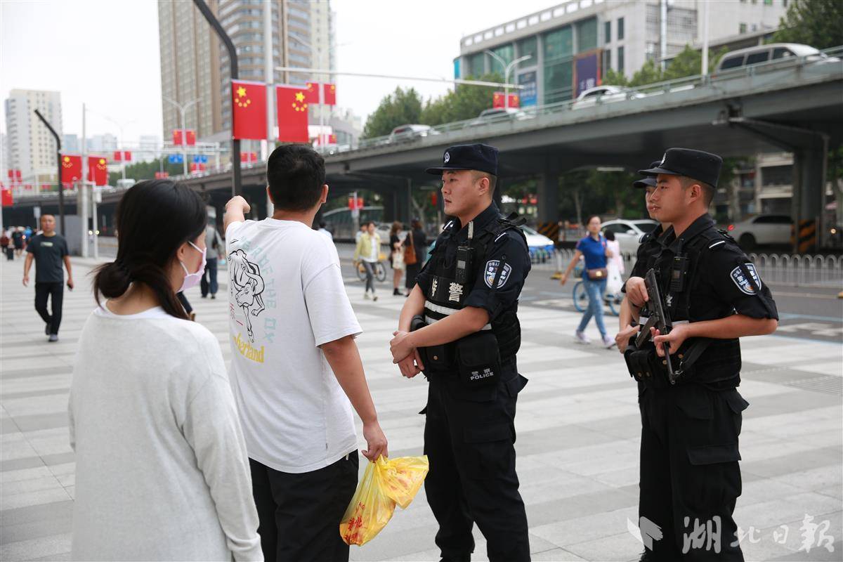 10月1日上午,武漢廣場商圈掛滿了鮮艷的國旗,“全國青年文明號”武漢市公安局特警支隊江北機動大隊的青年特警王君正在駐巡崗周邊開展武裝巡邏。一名山東來漢游客因為不熟悉路況,向特警隊員求助。特警隊員耐心地為游客指明方向,并叮囑其注意遵守交通規則,確保自身安全。王君說,今年中秋國慶雙節期間,他將和戰友們一起守護好這片廣場的安寧,全力服務好人民群眾。
