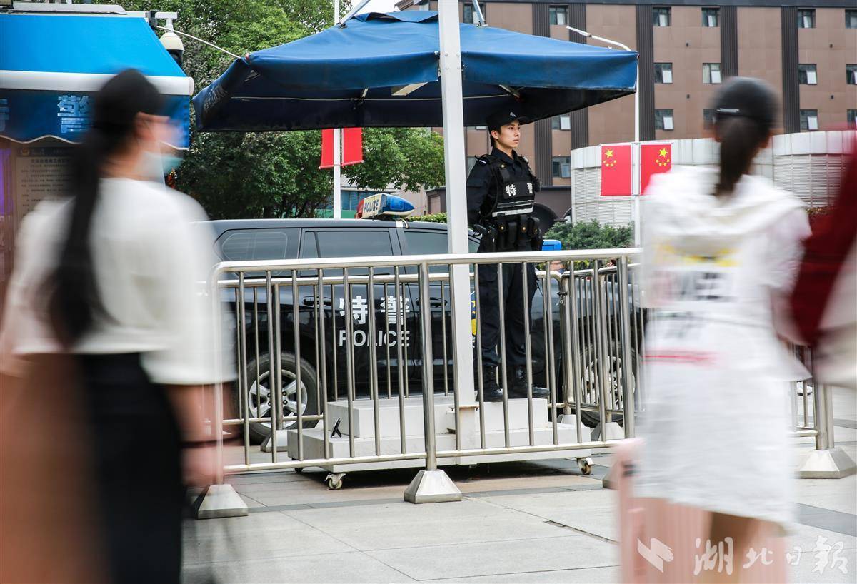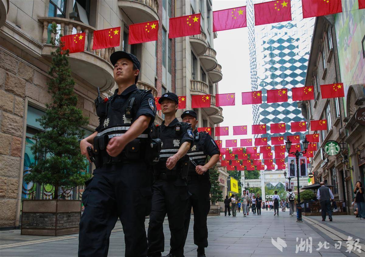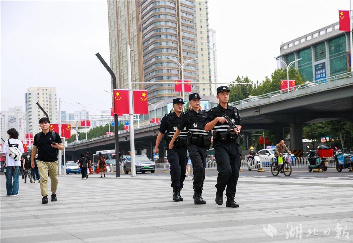 在地鐵站、火車站、熱門景點和各大商圈,武漢特警隊員們堅守在各自崗位,守護著城市的平安,他們用最質樸的方式表達對祖國的祝福,在鮮艷的五星紅旗下守護萬家團圓。