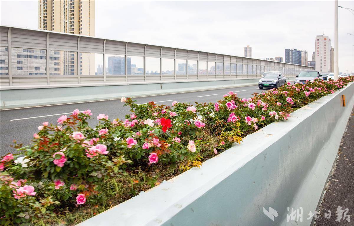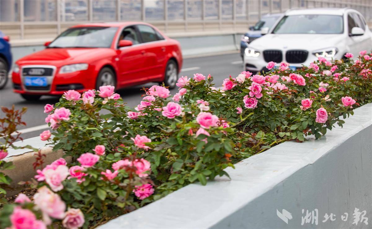 國慶黃金周期間,駕車從武漢機場高速上常青路高架后,嫣紅的月季花裝扮高架中分帶,一路繁花似錦,迎接各地游客。