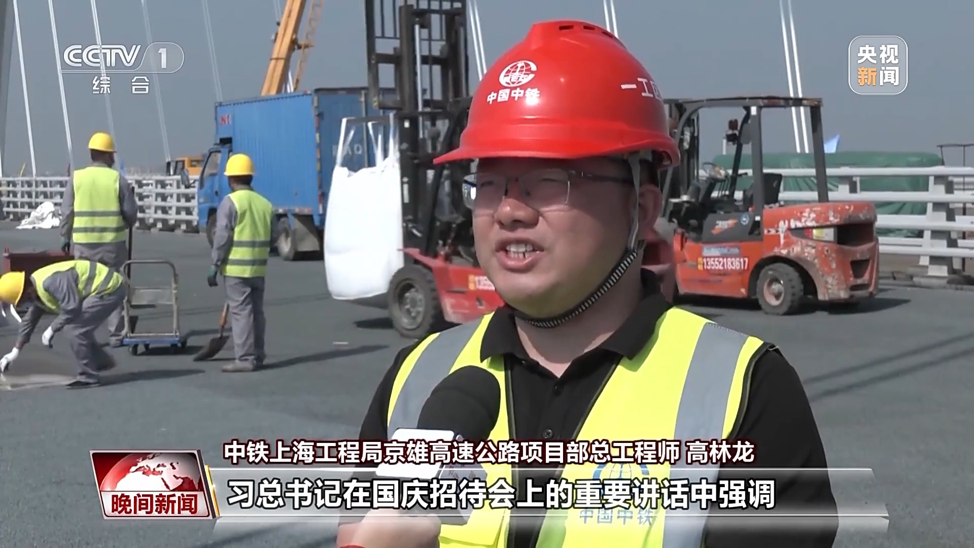 中鐵上海工程局京雄高速公路項目部總工程師 高林龍:習總書記在國慶招待會上的重要講話中強調,我們要堅定信心,振奮精神,團結奮斗,在中秋國慶假期,現場近300名建設者在這里二十四小時三班倒作業,進行橋面鋪裝和機電設備安裝,全力保障今年年內京雄高速公路全線貫通。