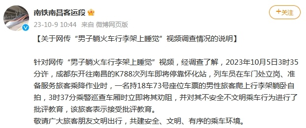 中新網10月9日電 據中國鐵路南昌局集團有限公司南昌客運段官方微博消息,針對網傳“男子躺火車行李架上睡覺”視頻,經調查了解,2023年10月5日3時35分許,成都東開往南昌的K788次列車即將停靠懷化站,列車員在車門處立崗、準備服務旅客乘降作業時,一名持18車73號座位車票的男性旅客爬上行李架躺臥自拍,3時37分乘警巡查車廂時立即將其勸阻,并對其不安全不文明乘車行為進行了批評教育,該旅客表示接受批評教育。