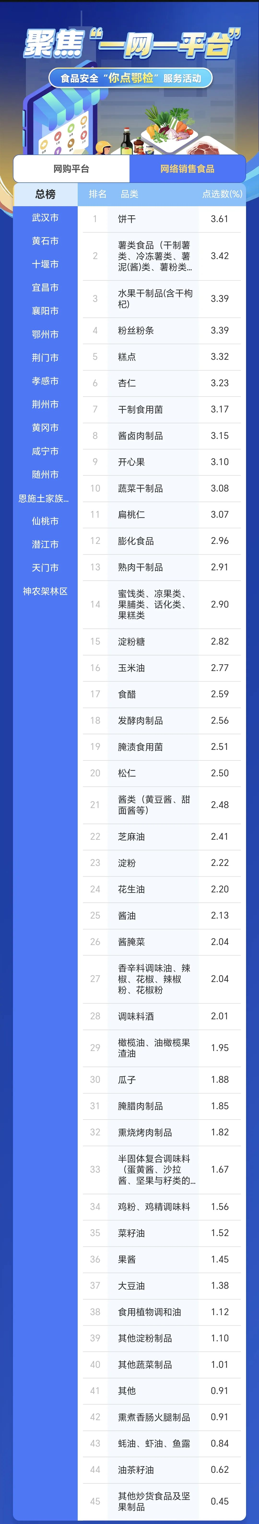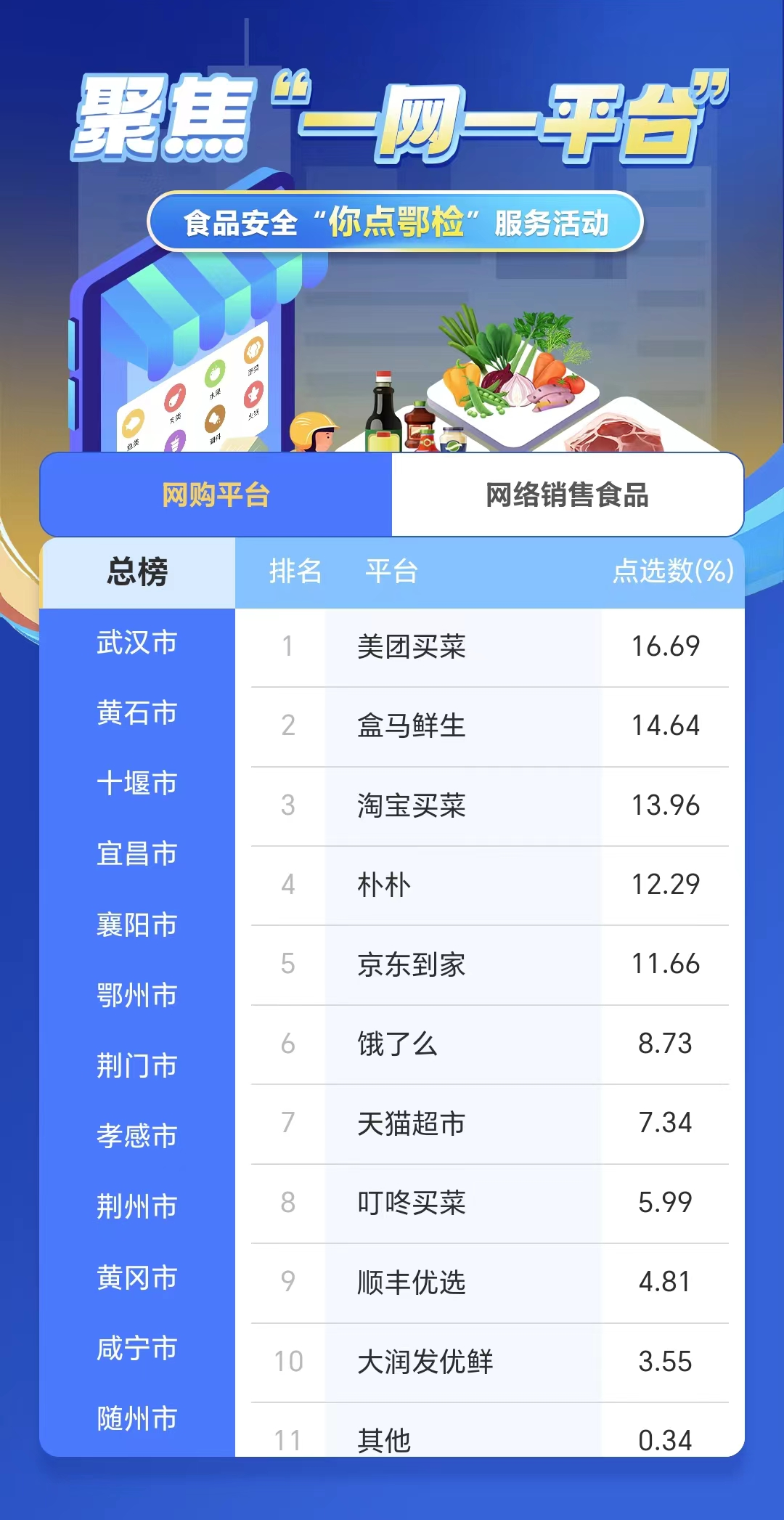 第三期活動聚焦“一網一平臺”,圍繞食品網購平臺和食品種類面向全省17個市州開展點選。為方便全省消費者共同參與,省市場監管局傾力打造了你點鄂檢微信小程序,并在官方微信公眾號上開設了“你點鄂檢”活動專欄,于9月29日正式啟動點選。
