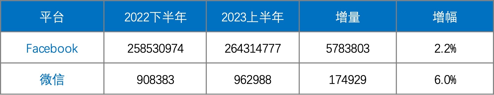 傳播效果方面,世界華文傳媒在主要新媒體平臺的主要業務指標整體向好。與2022年下半年相比,華文媒體各平臺用戶互動數據有明顯提升。具體平臺方面,Facebook、微信的點贊總量較2022年下半年增幅明顯,體現出平臺有效受眾群體的穩步增長。而微博和Twitter的用戶條均評論量增幅較為明顯,體現出這兩個平臺的用戶參與討論的意愿更強。