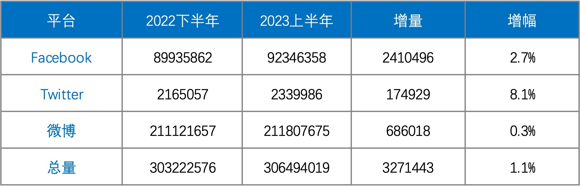 受眾方面,世界華文傳媒新媒體用戶數持續穩步增長。從社交媒體粉絲量看,Facebook、Twitter、微博三大平臺粉絲均有一定程度的增長,總量增加約327萬,較2022年下半年增幅約為1.1%。其中,Facebook的粉絲總量增長較大,Twitter的粉絲總量增幅相對較大,而微博的粉絲總量則趨于飽和,增長率相對較低。