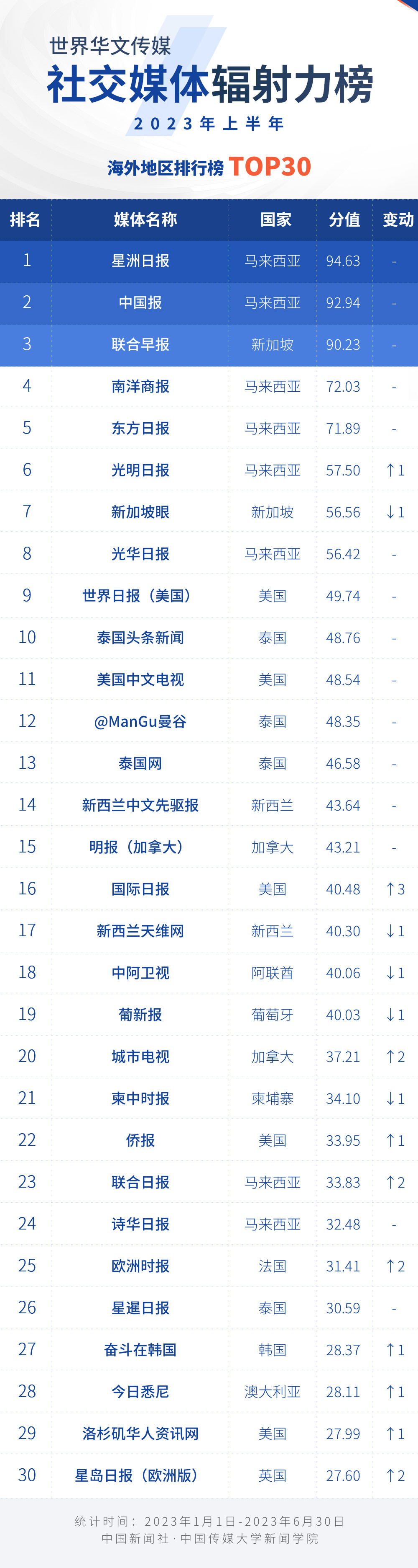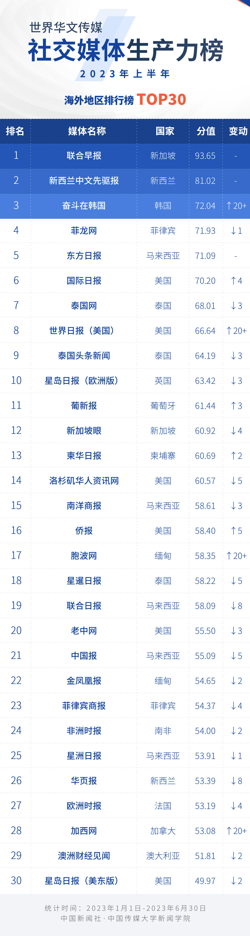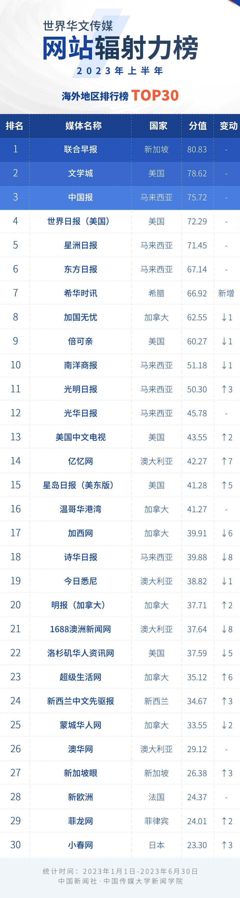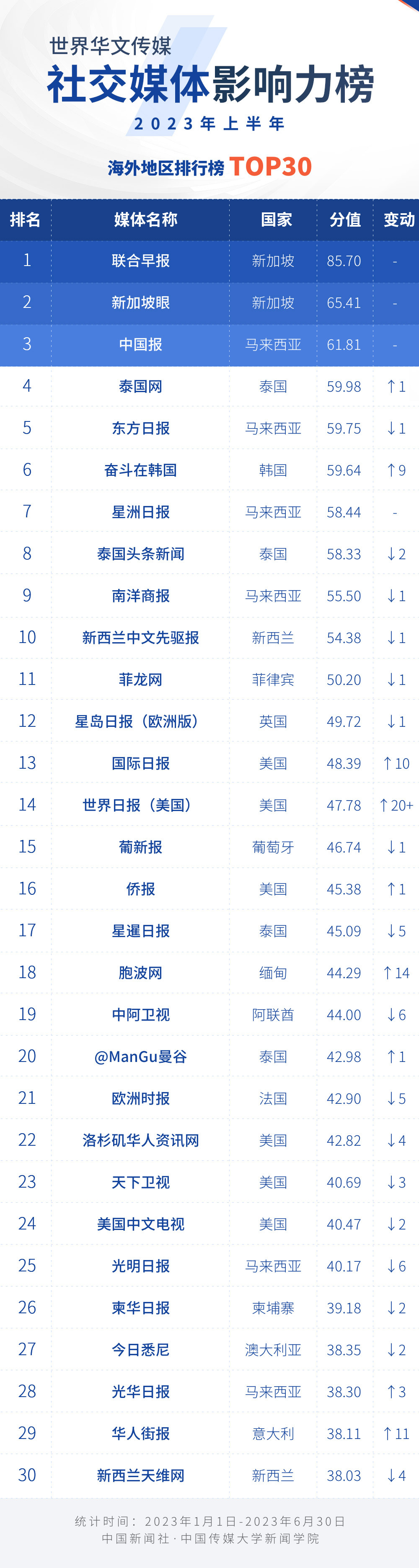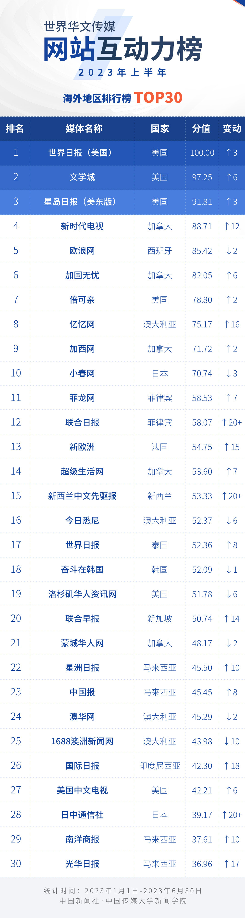 中國新聞社與中國傳媒大學新聞學院持續開展“世界華文傳媒新媒體影響力”測評項目,現根據2023年上半年世界華文傳媒新媒體的業務數據,發布2023年上半年榜。