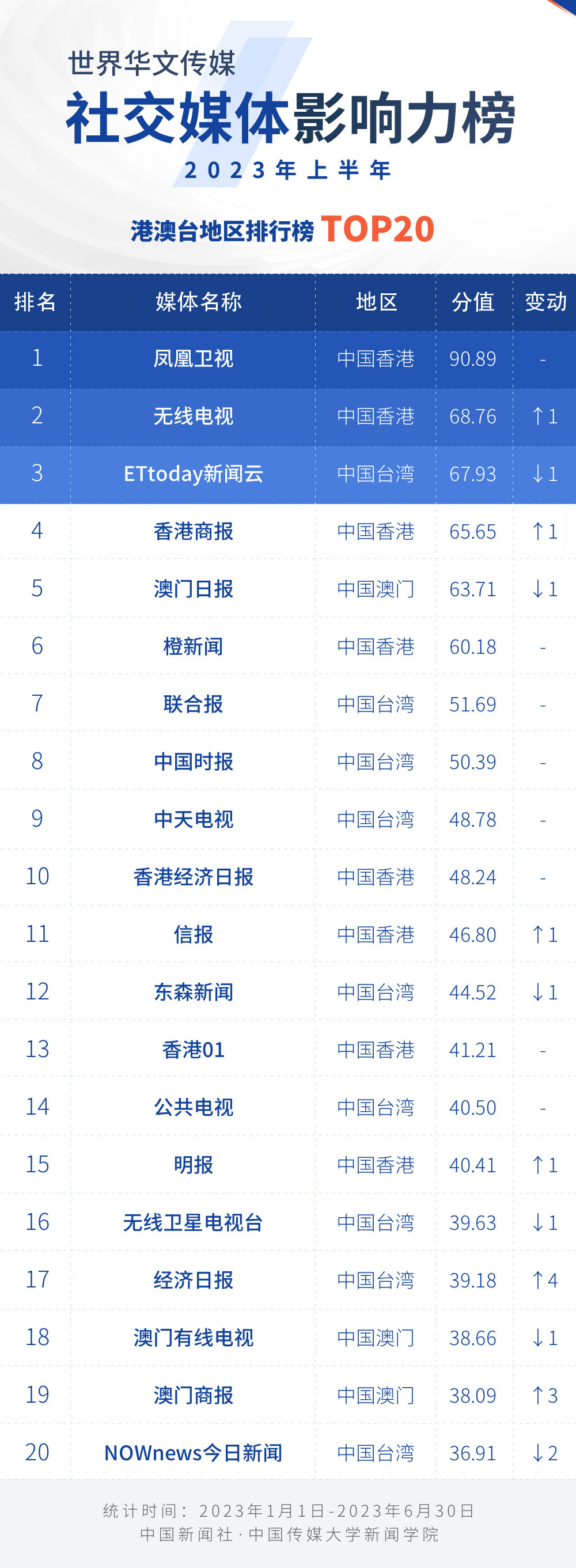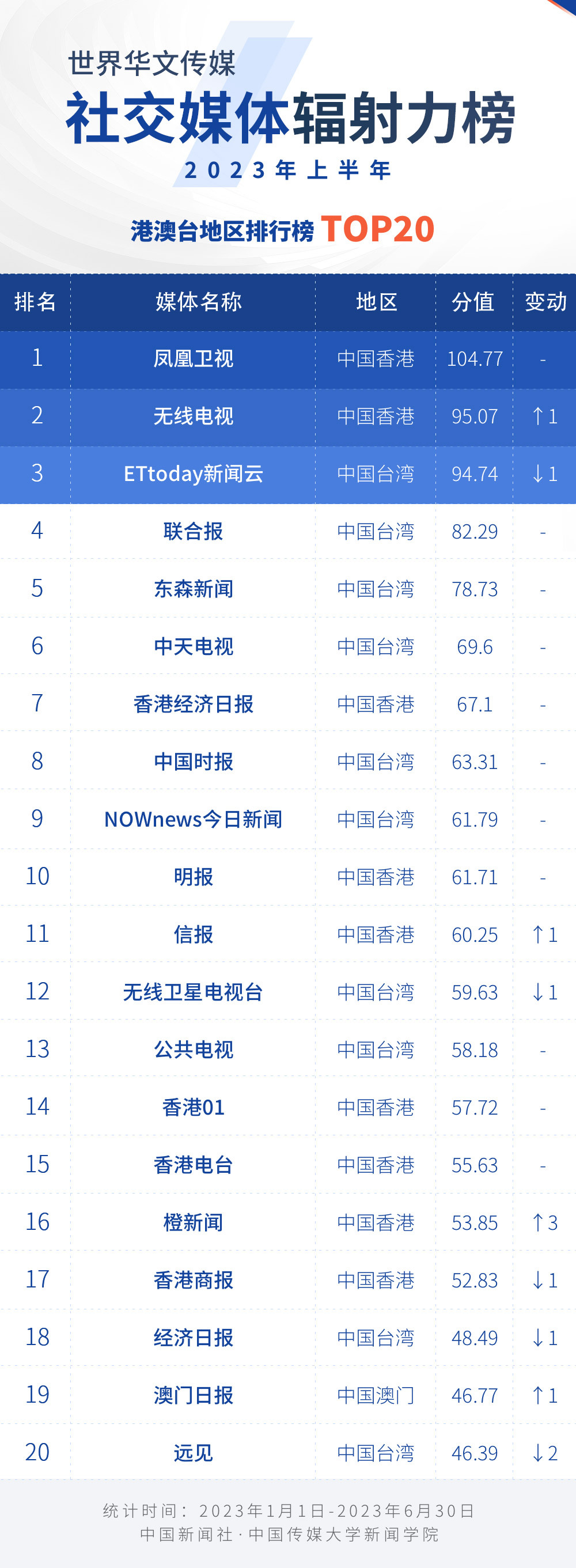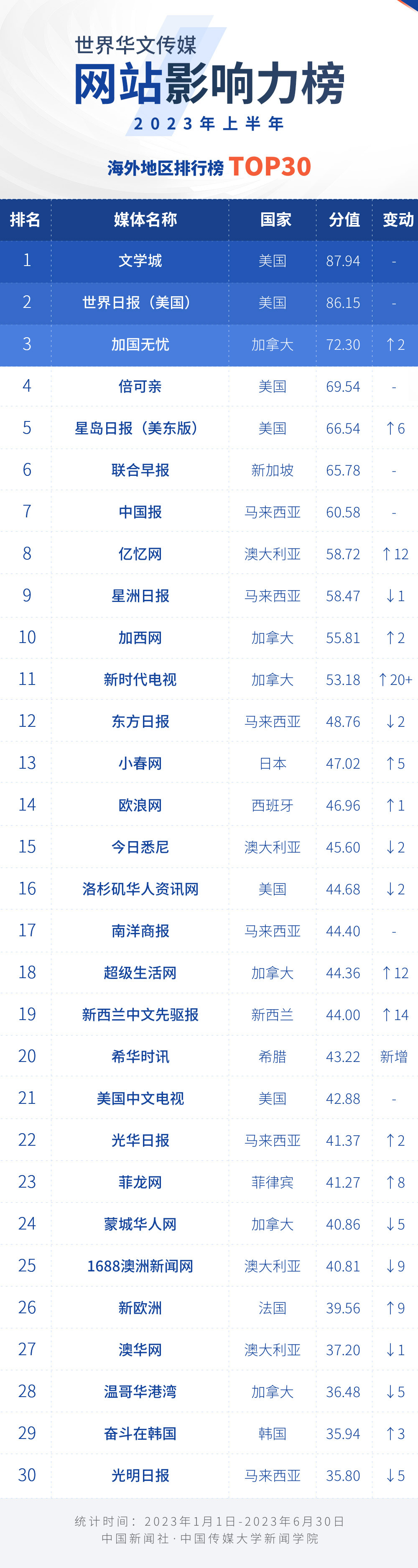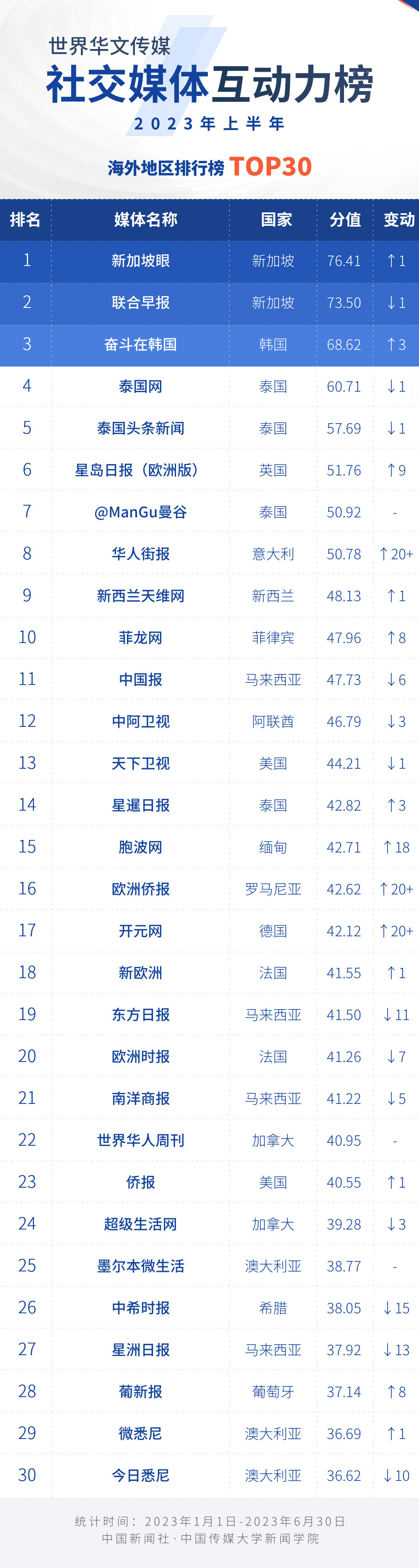 中國新聞社與中國傳媒大學新聞學院持續開展“世界華文傳媒新媒體影響力”測評項目,現根據2023年上半年世界華文傳媒新媒體的業務數據,發布2023年上半年榜。