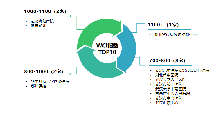 從WCI指數來看,前十名賬號WCI值整體較之前變動不大,WCI值超過1100的賬號有1家,是“湖北省疾病預防控制中心”;1000-1100指數區間的有2家,為“武漢協和醫院”“健康湖北”;800-1000指數區間的有2家,分別是“華中科技大學同濟醫院”“鄂州疾控”;700-800指數區間有8家,分別為“武漢兒童醫院武漢市婦幼保健院”“湖北省中醫院”“武漢大學人民醫院”“武漢市第一醫院”“武漢大學中南醫院”“宜昌市中心人民醫院”“武漢市中心醫院”“武漢血液中心”。