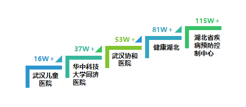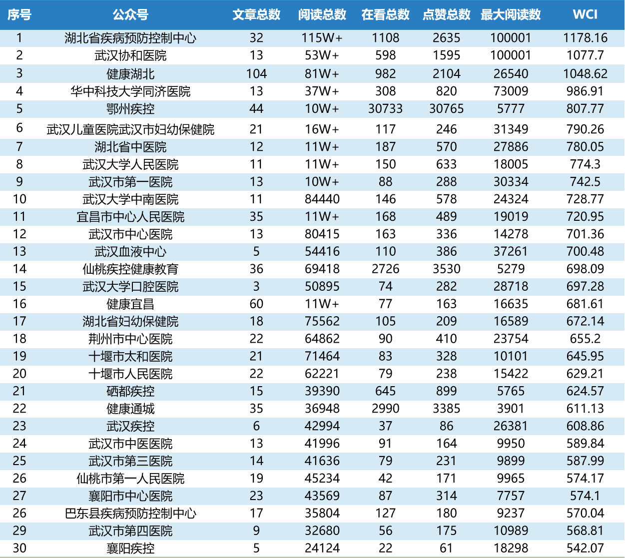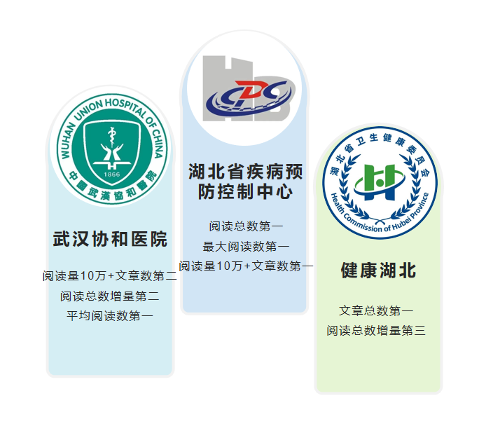 從文章閱讀總數來看,“湖北省疾病預防控制中心”成績亮眼,以115W+閱讀總數遙遙領先。“健康湖北”以81W+排第二,“武漢協和醫院”以53W+位列第三名,“華中科技大學同濟醫院”以37W+緊隨其后排第四,“武漢兒童醫院武漢市婦幼保健院”以16W+排第五名。