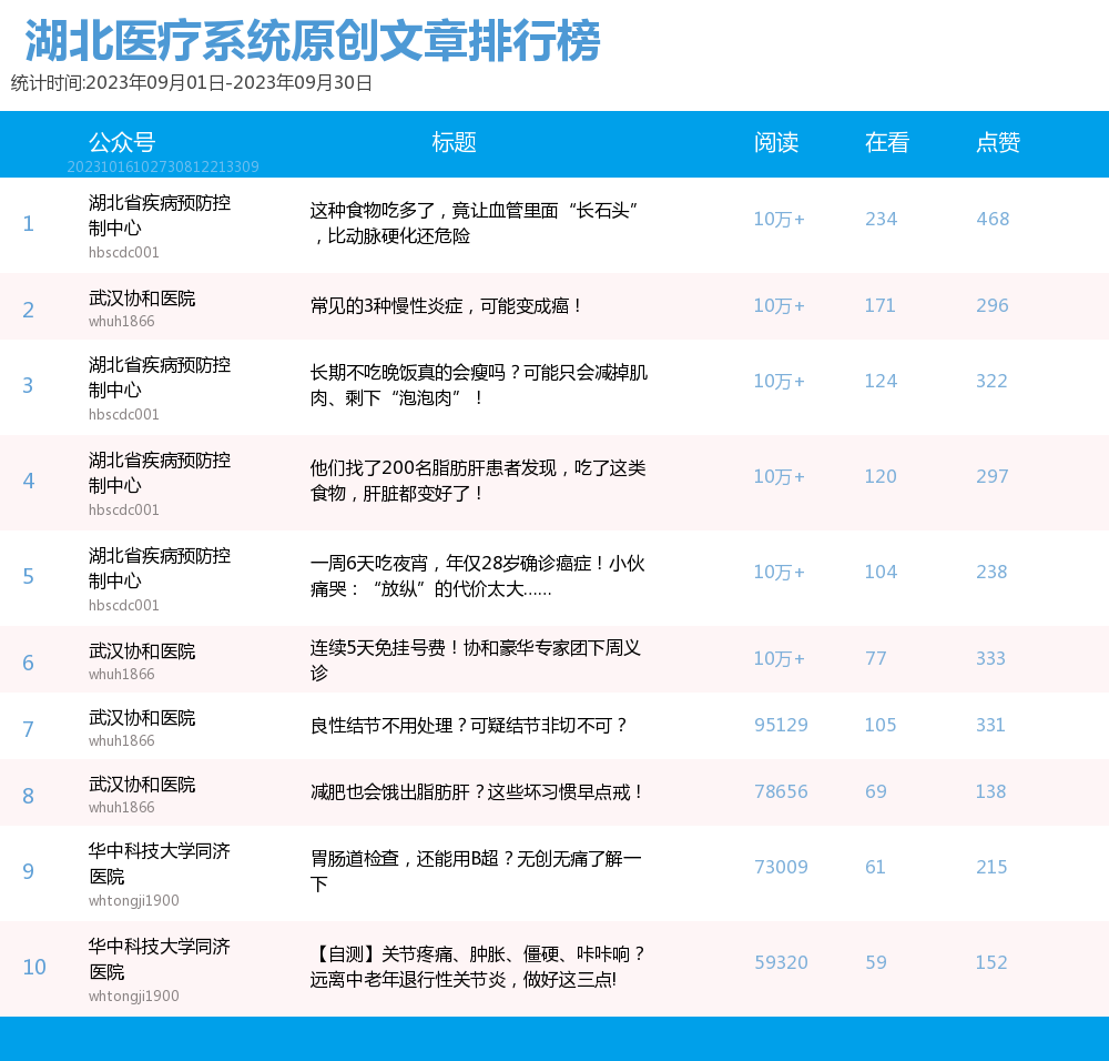 圖:湖北醫療微信排行榜9月榜單TOP30