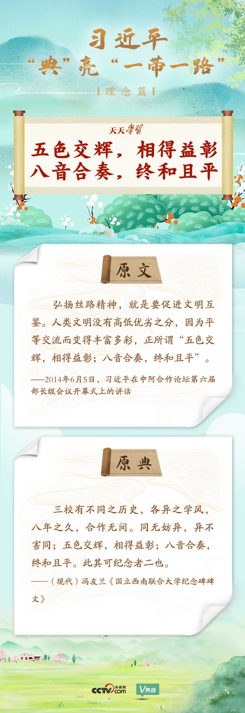 在國內國際多個重要場合,習近平主席頻頻引經據典,介紹“一帶一路”承載的厚重歷史,闡述“一帶一路”建設的理念和重大意義,描繪“一帶一路”美好的發展愿景。央視網《天天學習》欄目特選取習近平主席的部分用典,與您一起學習領會。