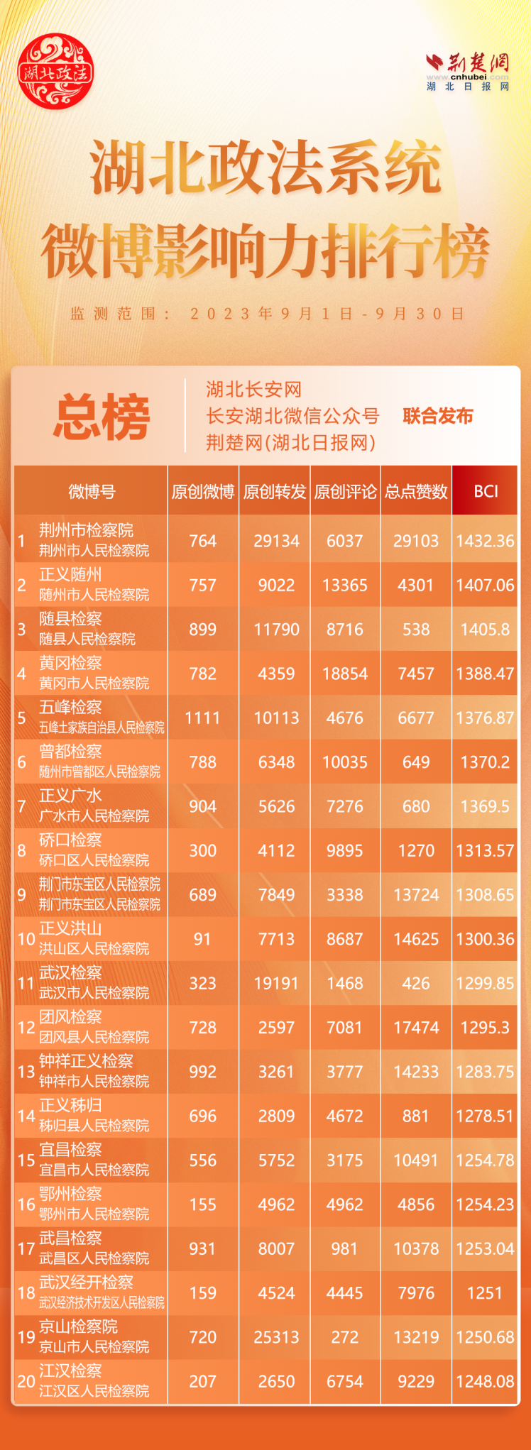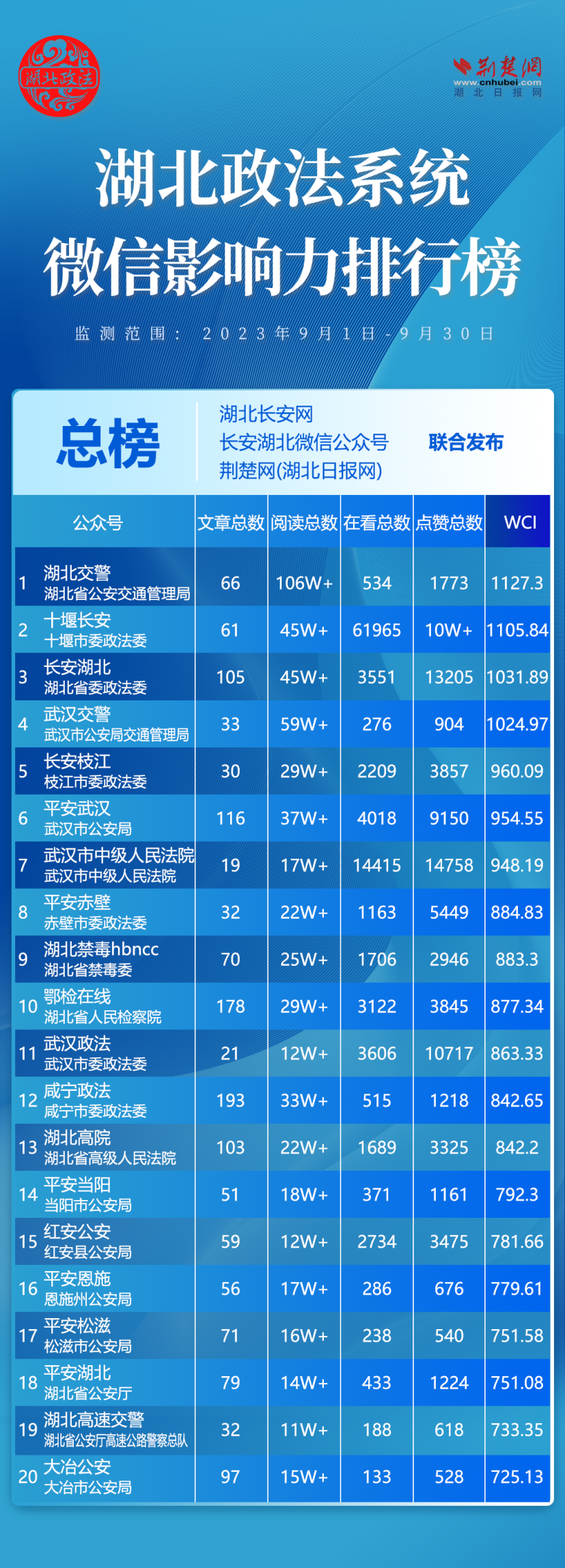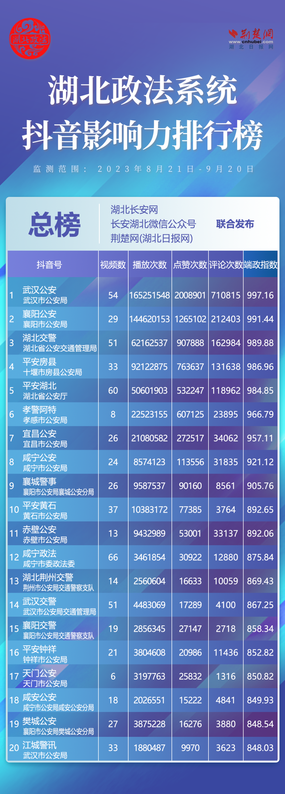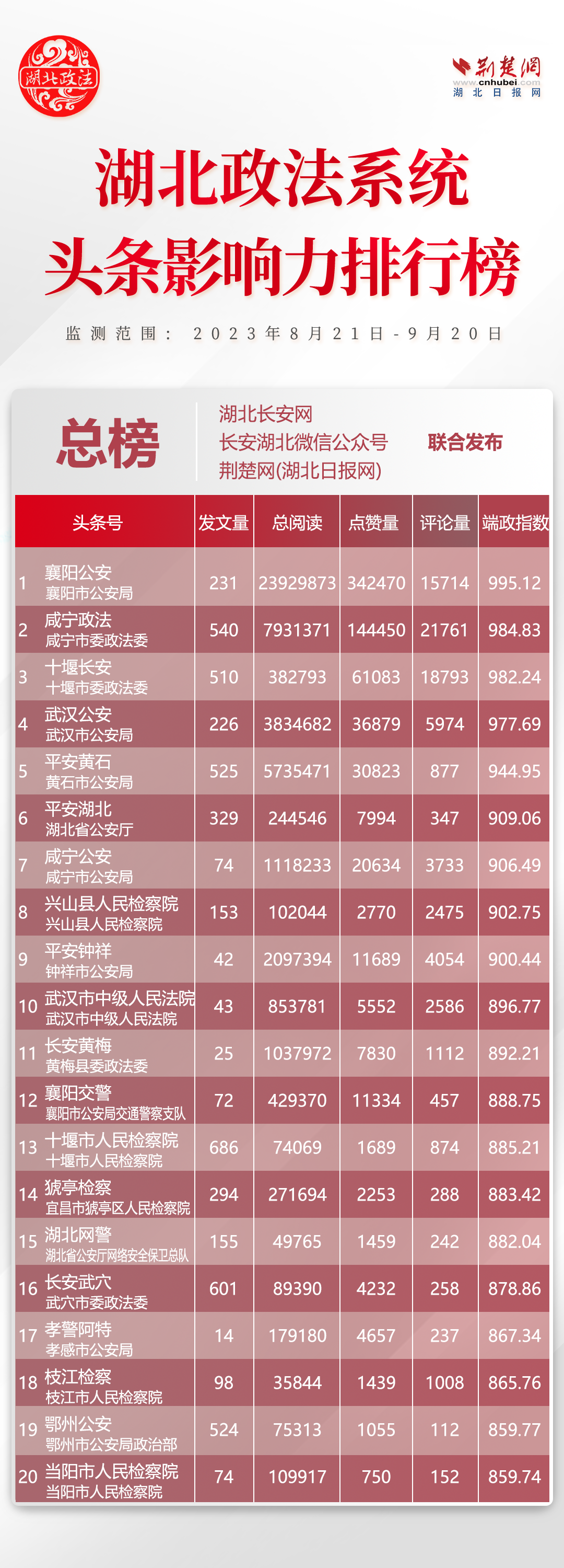 10月16日,湖北省委政法委官網湖北長安網、官微長安湖北,聯合荊楚網(湖北日報網)、楚天輿情數據研究院發布湖北政法系統新媒體影響力排行9月榜單。具體榜單如下: