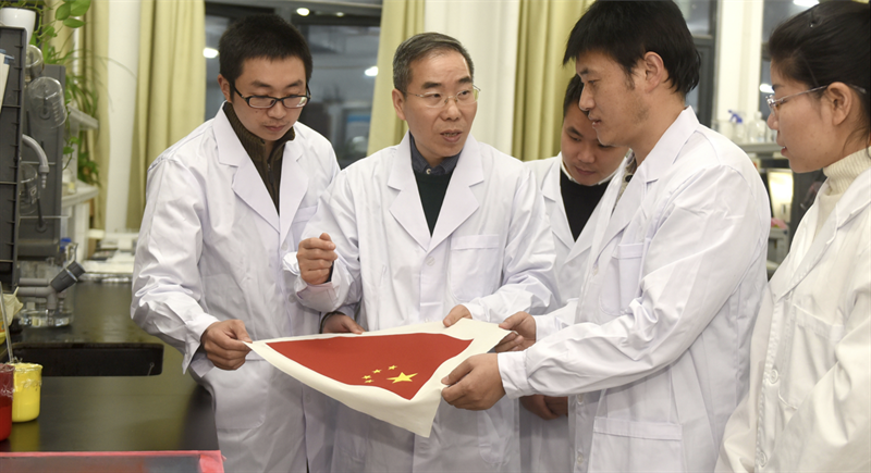 曹根陽教授2012年起跟隨徐衛林院士,用自己的青春助力旗開月表、五星閃耀。國旗任務研制期間,牢記自己教書育人的使命,建立了功能面料創新人才工作室,培養了面料開發人才上百人。他還帶領學生先后斬獲挑戰杯湖北省特等獎和全國特等獎,成功探索出紡織專業培養解決復雜問題能力的新途徑,助力新工科人才的培養。