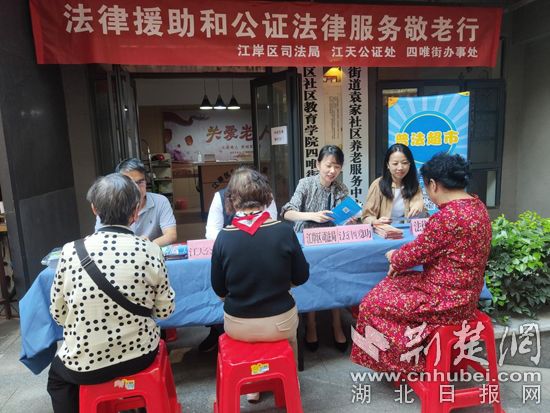 荊楚網(wǎng)(湖北日報網(wǎng))訊(通訊員王靖、許靜、袁祎、何世朝)又到一年重陽時,袁家社區(qū)長者驛棧里,江岸“普法超市”熱鬧開張。為弘揚中華民族尊老、敬老、愛老、助老傳統(tǒng)美德,保障老年人合法權(quán)益,10月18日下午,江岸區(qū)司法局(江岸區(qū)公共法律服務(wù)中心)聯(lián)合武漢市江天公證處、四唯街道辦事處、湖北江浩律師事務(wù)所組織法律援助工作者、律師、公證員、司法所工作人員、社區(qū)“法律明白人”,在四唯街袁家社區(qū)養(yǎng)老服務(wù)中心開展了以“尊老愛老、便民惠民”為主題的法律援助和公證法律服務(wù)活動,為老人們送上關(guān)愛與祝福。