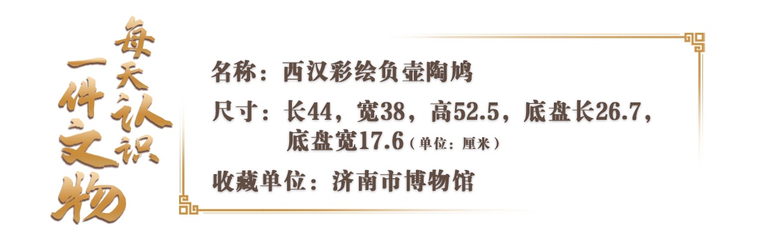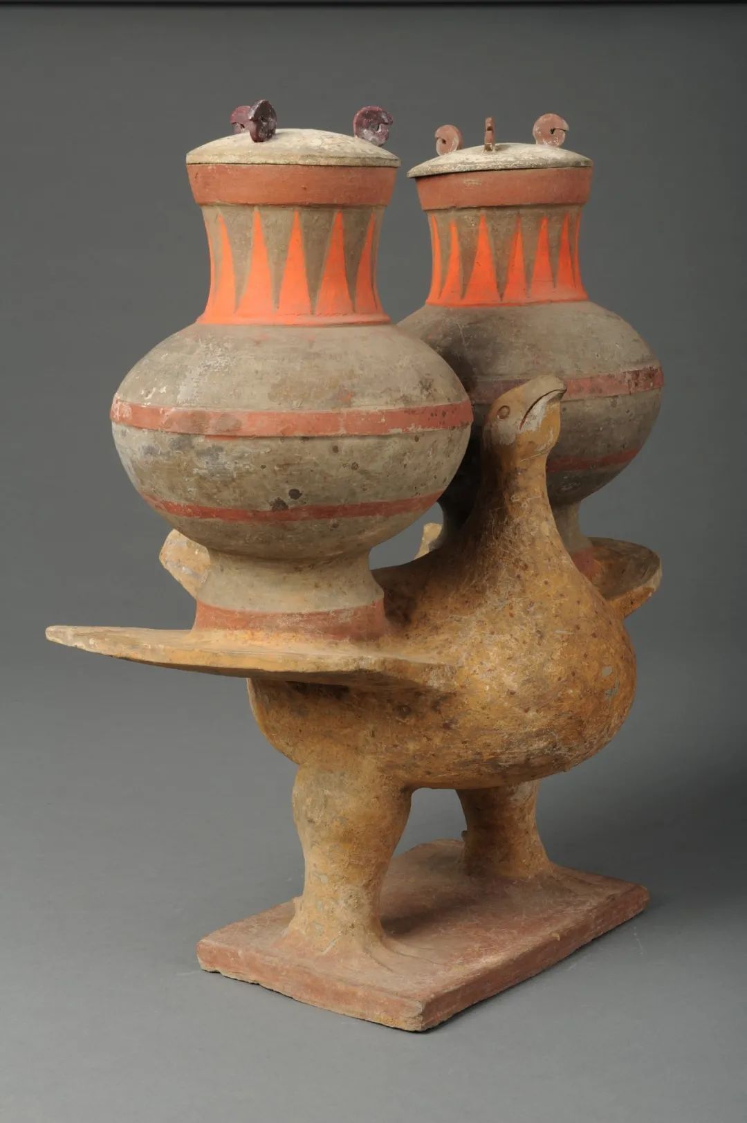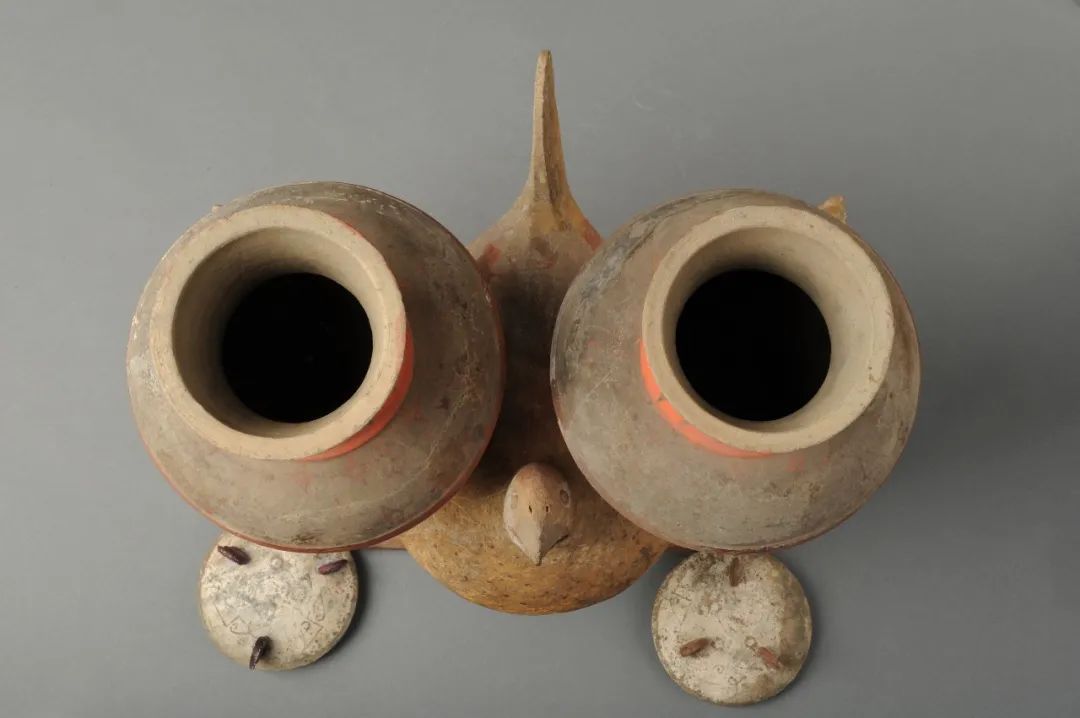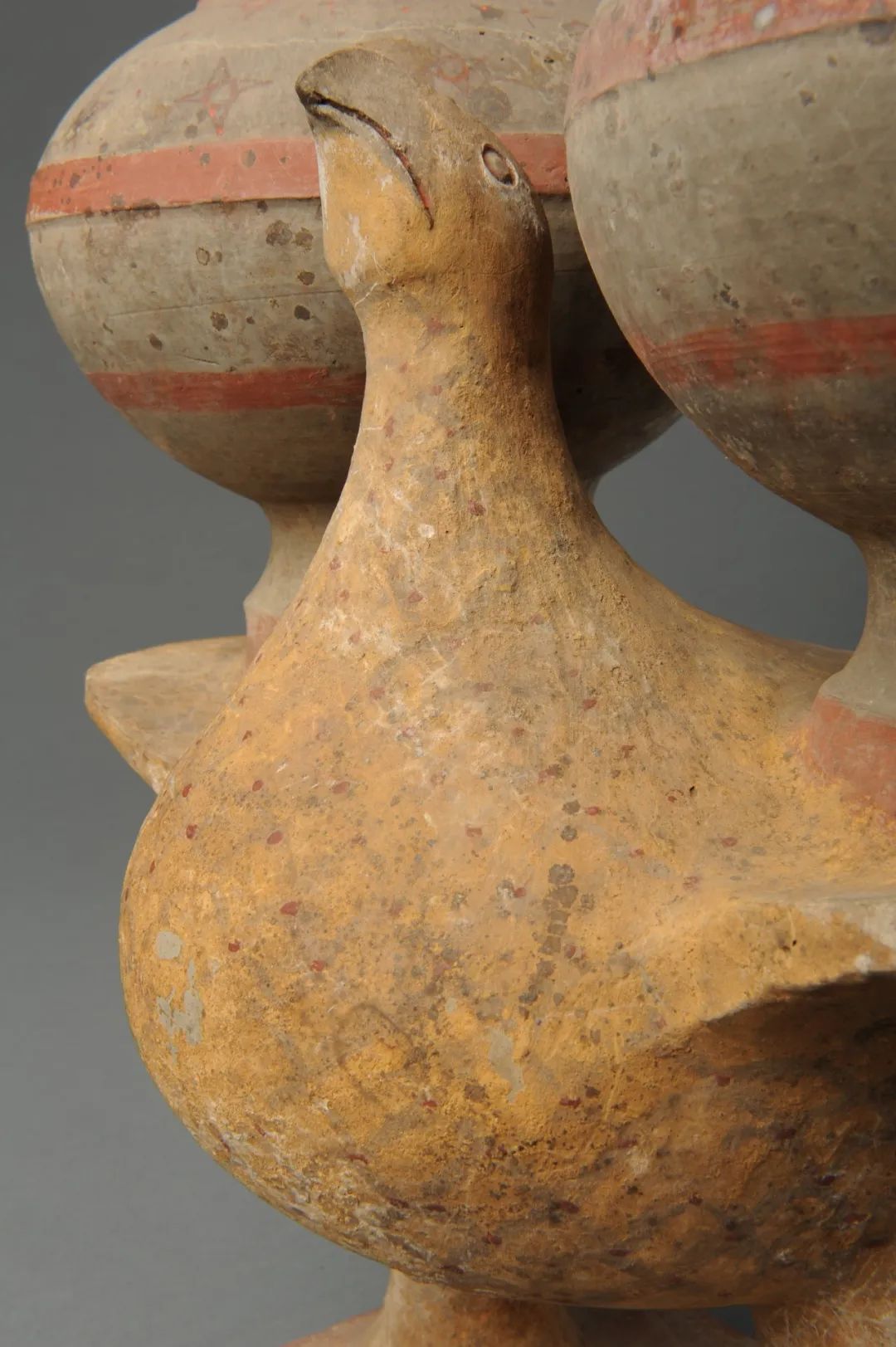△ 鳩鳥兩翼所負的彩繪陶壺是用來盛糜粥的。壺蓋上還有3個鳥頭形狀的扁紐,與陶鳩相呼應(yīng)。