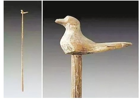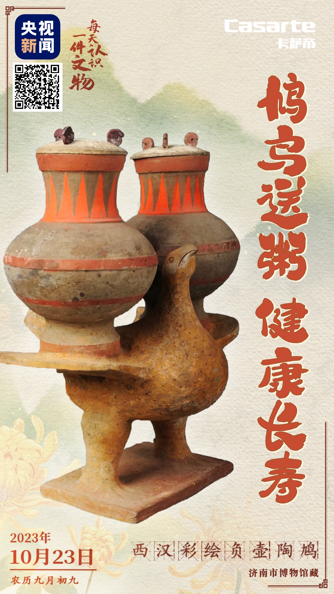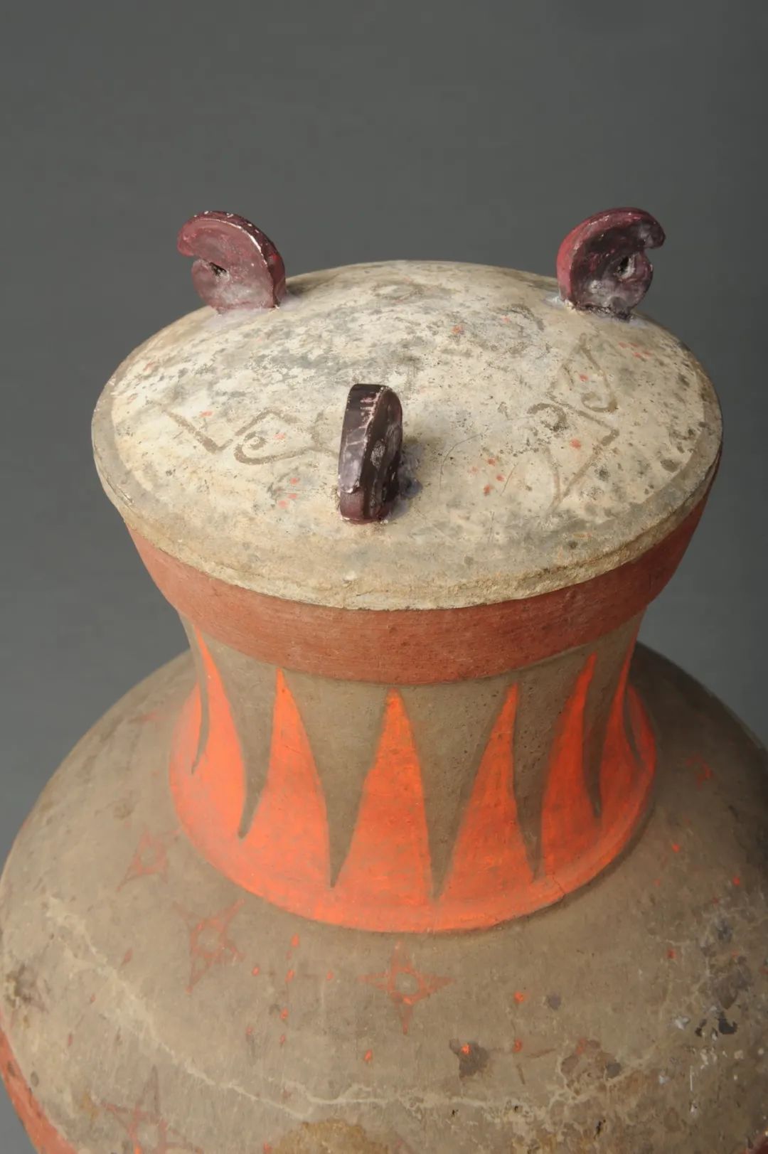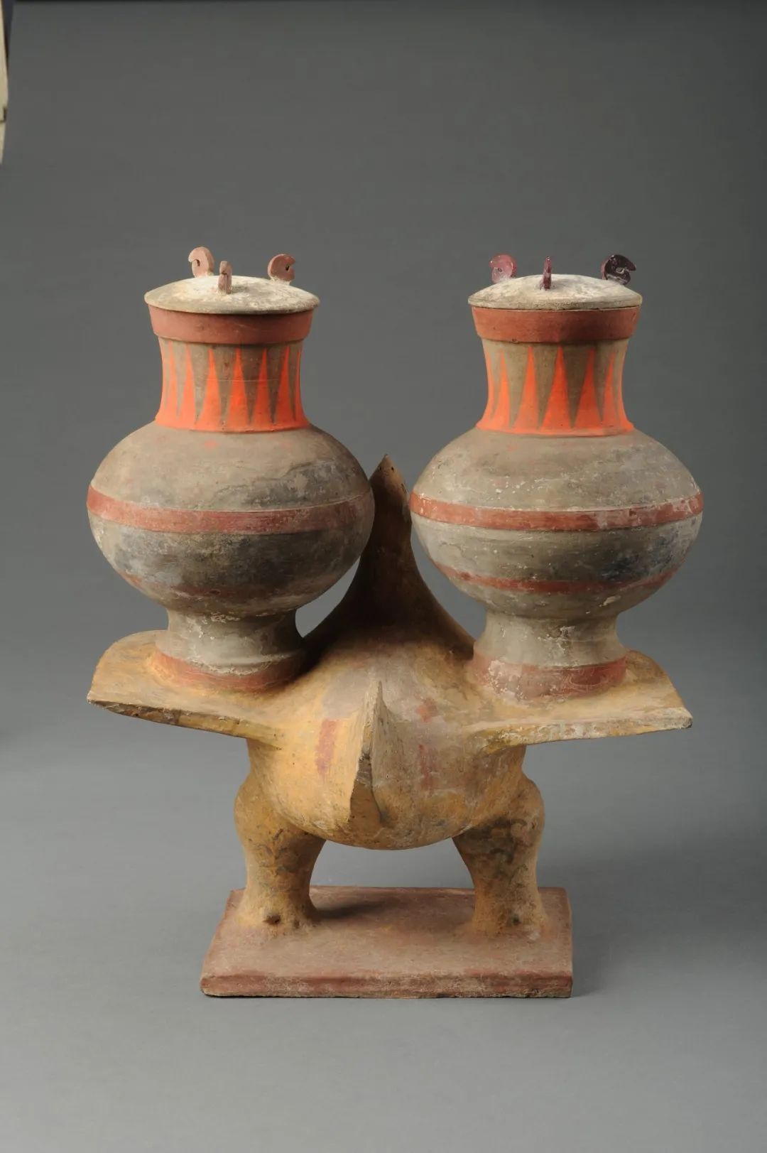 △ 鳩鳥兩翼所負的彩繪陶壺是用來盛糜粥的。壺蓋上還有3個鳥頭形狀的扁紐,與陶鳩相呼應(yīng)。
