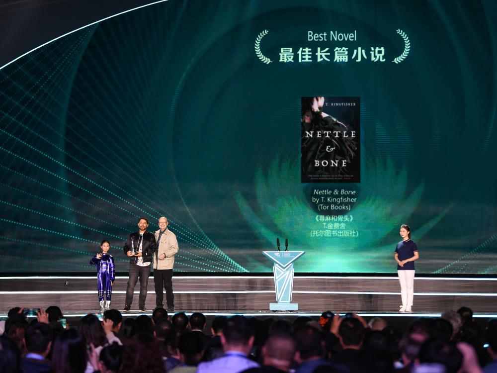 10月21日,嘉賓為最佳長篇小說《蕁麻和骨頭》頒獎。新華社記者 王曦 攝