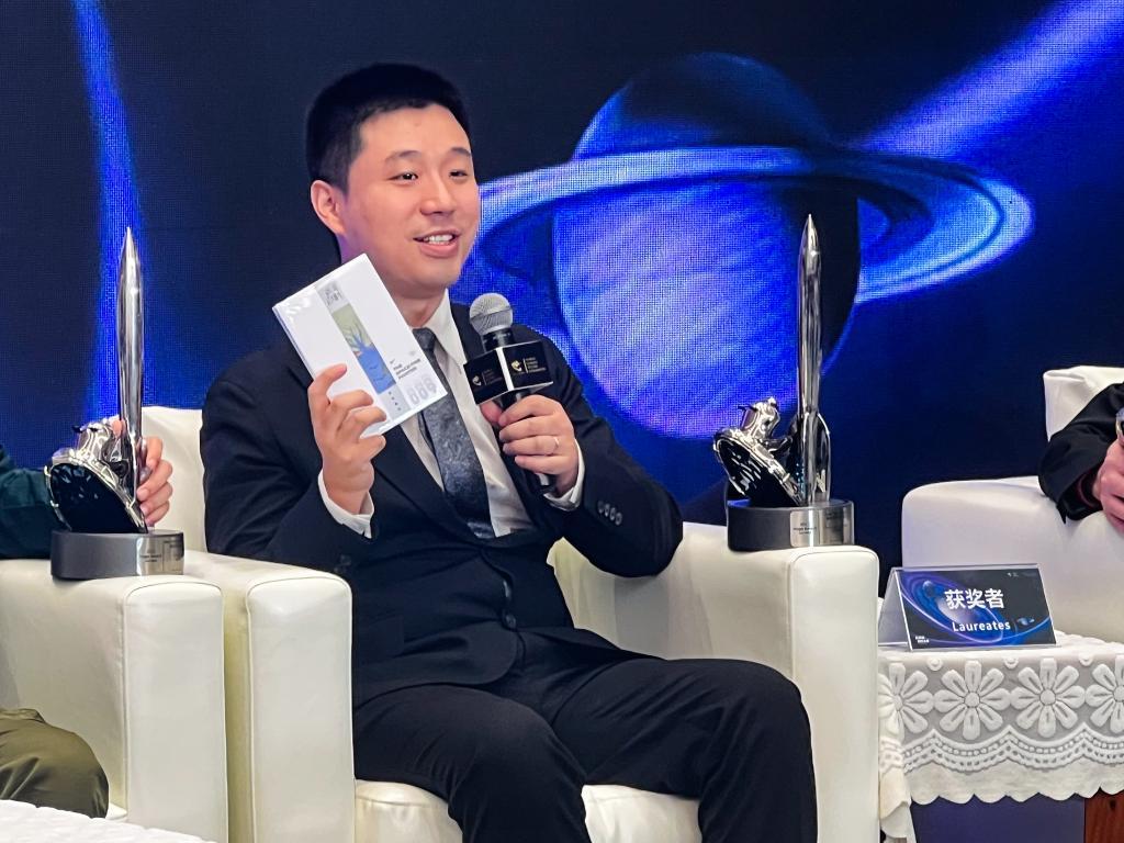 10月21日,中國作家海漄(中)創作的《時空畫師》獲最佳短中篇小說獎。新華社記者 王曦 攝