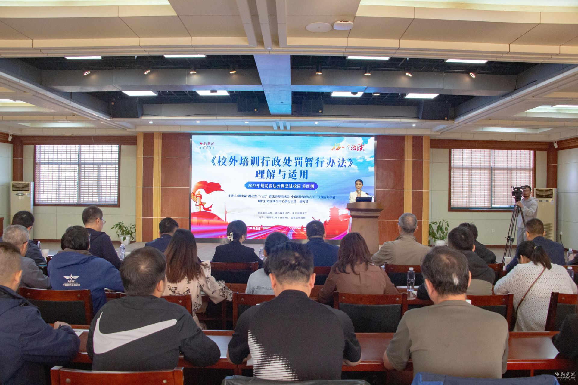 本次直播課邀請湖北省“八五”普法講師團成員,中南財經政法大學“文瀾青年學者”,現代行政法研究中心執行主任、研究員譚冰霖,進行“《校外培訓行政處罰暫行辦法》理解與適用”主題授課。省教育廳、武昌區教育局、武昌區司法局、武昌區文旅局等有關人員,以及部分中小學校長、教師代表、學生家長代表、培訓機構代表和律師事務所代表到場聽課。