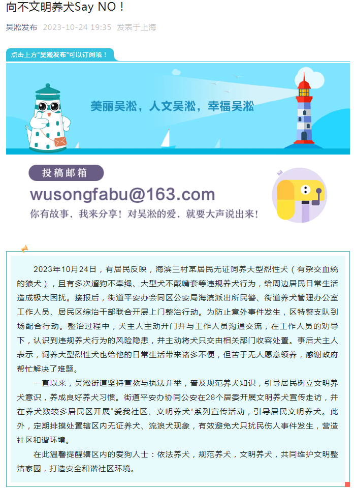 2023年10月24日,有居民反映,上海吳淞海濱三村某居民無證飼養大型烈性犬(有雜交血統的狼犬),且有多次遛狗不牽繩、大型犬不戴嘴套等違規養犬行為,給周邊居民日常生活造成極大困擾。接報后,街道平安辦會同區公安局海濱派出所民警、街道養犬管理辦公室工作人員、居民區綜治干部聯合開展上門整治行動。為防止意外事件發生,區特警支隊到場配合行動。整治過程中,犬主人主動開門并與工作人員溝通交流,在工作人員的勸導下,認識到違規養犬行為的風險隱患,并主動將犬只交由相關部門收容處置。事后犬主人表示,飼養大型烈性犬也給他的日常生活帶來諸多不便,但苦于無人愿意領養,感謝政府幫忙解決了難題。一直以來,吳淞街道堅持宣教與執法并舉,普及規范養犬知識,引導居民樹立文明養犬意識,養成良好養犬習慣。街道平安辦協同公安在28個居委開展文明養犬宣傳走訪,并在養犬數較多居民區開展“愛我社區、文明養犬”系列宣傳活動,引導居民文明養犬。此外,定期排摸處置轄區內無證養犬、流浪犬現象,有效避免犬只擾民傷人事件發生,營造社區和諧環境。