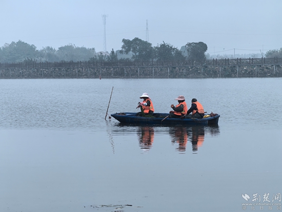 水草種植基地工人正于湖中種草。 記者 金康 攝