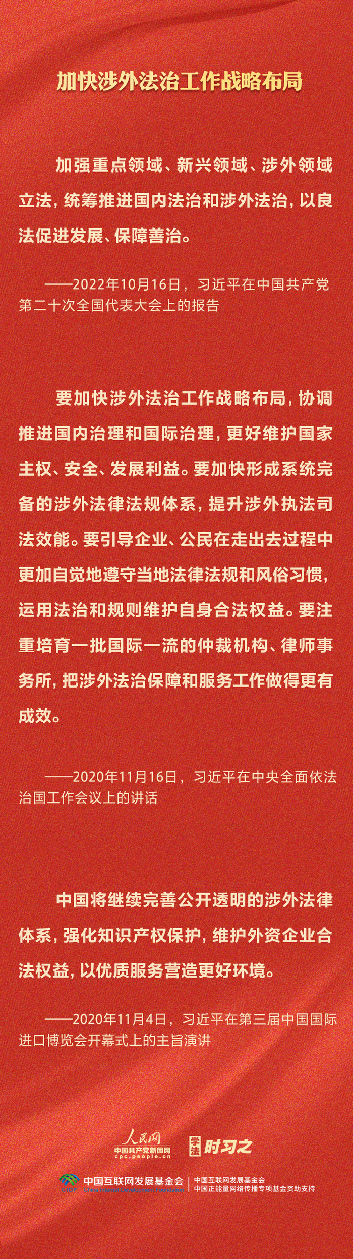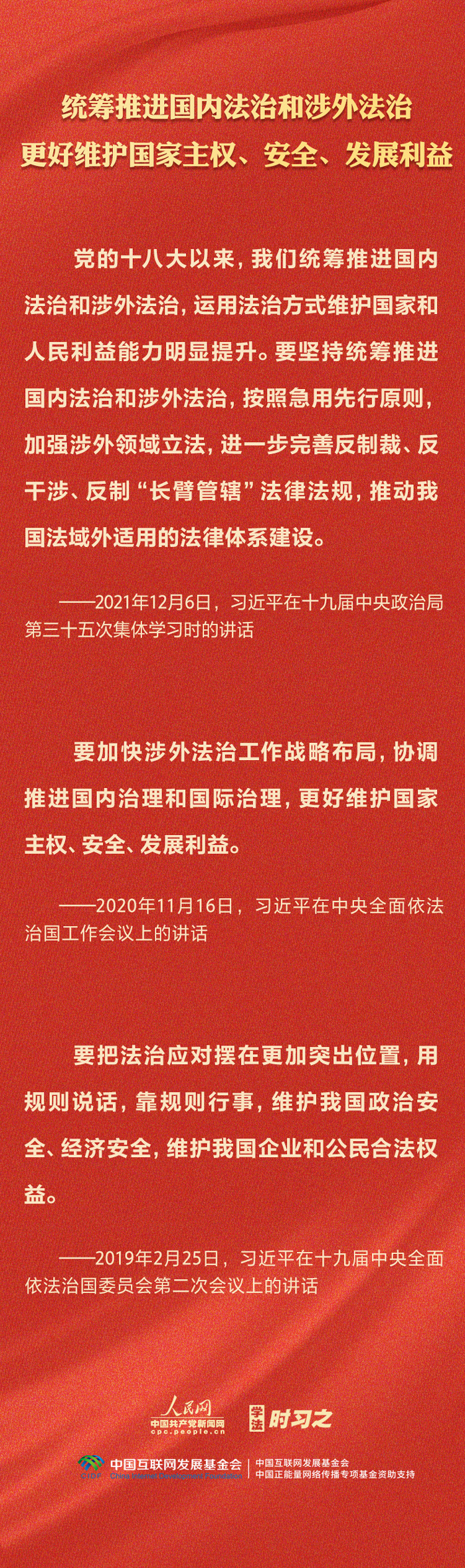 今年是貫徹落實黨的二十大精神的開局之年。中共中央政治局決定從今年4月開始,在全黨自上而下開展學習貫徹習近平新時代中國特色社會主義思想主題教育。習近平法治思想是習近平新時代中國特色社會主義思想的重要組成部分,人民網·中國共產黨新聞網推出學法時習之·學習習近平法治思想系列策劃,本篇聚焦“堅持統籌推進國內法治和涉外法治”。