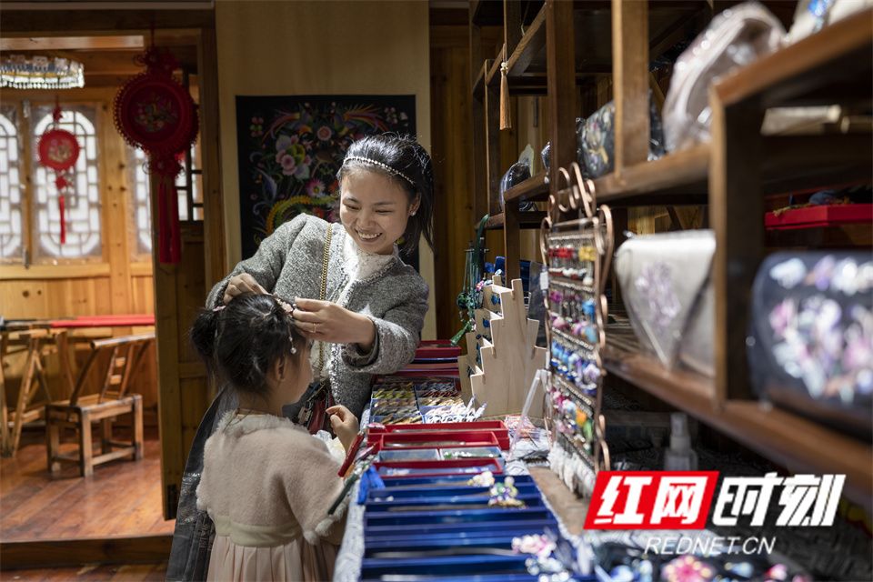 一對母女在苗繡基地試戴苗繡手工藝品。