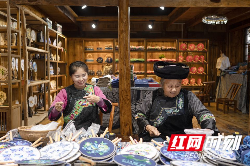 2014年,在老支書石順蓮的帶領下,十八洞村成立苗繡特產農民專業合作社。2018年,十八洞村啟動“苗繡讓媽媽回家計劃”,讓十八洞村的婦女們 “帶著娃,守著家、繡著花、有錢拿”。2022年,苗繡傳承人陳國桃成立了花垣十八洞苗繡文化產業有限公司,通過培訓,留守婦女們掌握了苗繡非遺技藝后,每月在家就能增收1200元至5000元左右。據統計,僅今年1-10月苗繡銷售收入就達到了620萬元,其中十八洞村苗繡實體店收入460萬元,線上及其他收入達160萬元。
