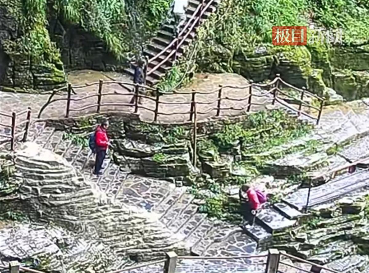 經過不懈努力,通過重點查看“臥龍吞江”段監控,從數百上千游客中排查甄別,發現了蛛絲馬跡,一名穿紅色衣服的女游客有彎腰撿拾“東西”的動作,并將拾到的“東西”拿去同行人員觀看。
