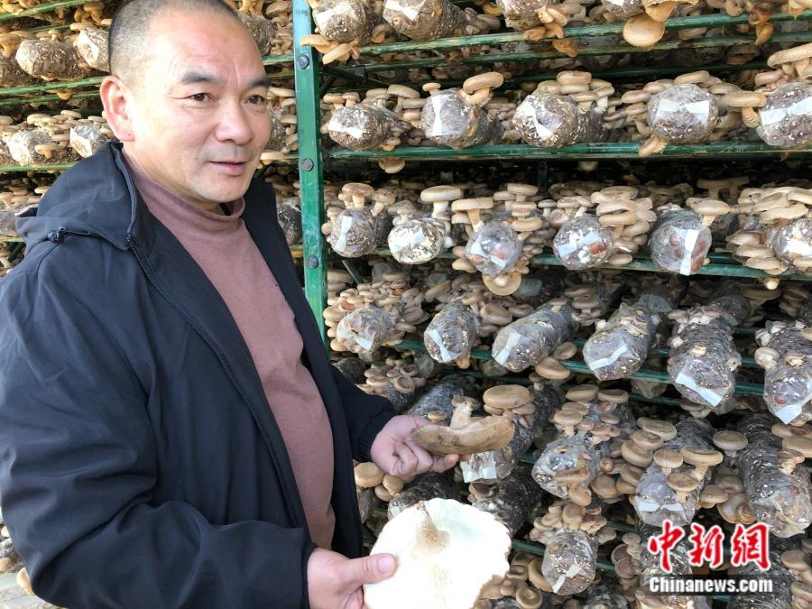 杉洋村菇農余新考正在展示他在光伏菇棚種植的蘑菇。中新網 張鈺惠 攝