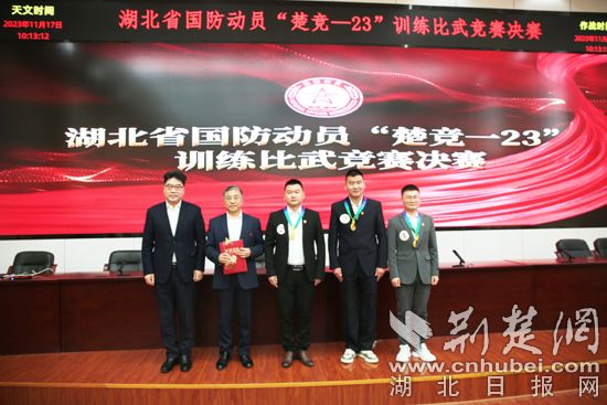 湖北省國動辦黨組書記、主任隋春龍(左一)與獲得一等獎隊伍合影。通訊員供圖。