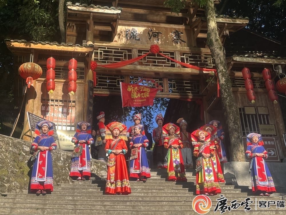 “劉三姐”在流河寨寨門唱歌迎客。記者 葉焱焱 攝