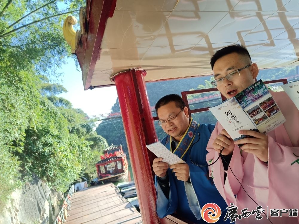 “唱山歌咧!這邊唱來那邊和!”11月20日下午,“新興河池 綠動文旅——全國主流新媒體看河池大型采訪活動”采訪團乘坐游船一路領略風景迷人的下枧河,前往劉三姐故里景區與“劉三姐”對唱山歌。來自全國各地的媒體記者們,被秀美的下枧河風光所吸引,更是被熱情好客的壯族群眾所感動。
