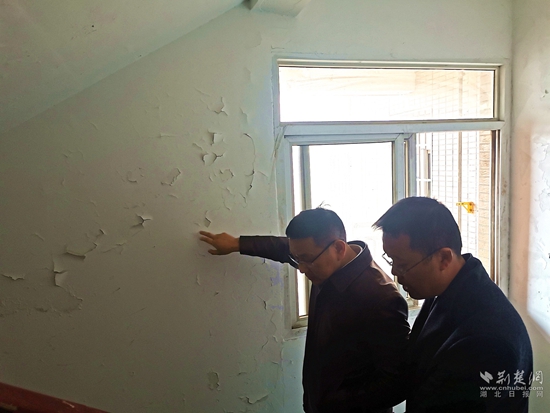 柯兵與社區人員查看樓道墻皮大面積脫落問題。通訊員 供圖