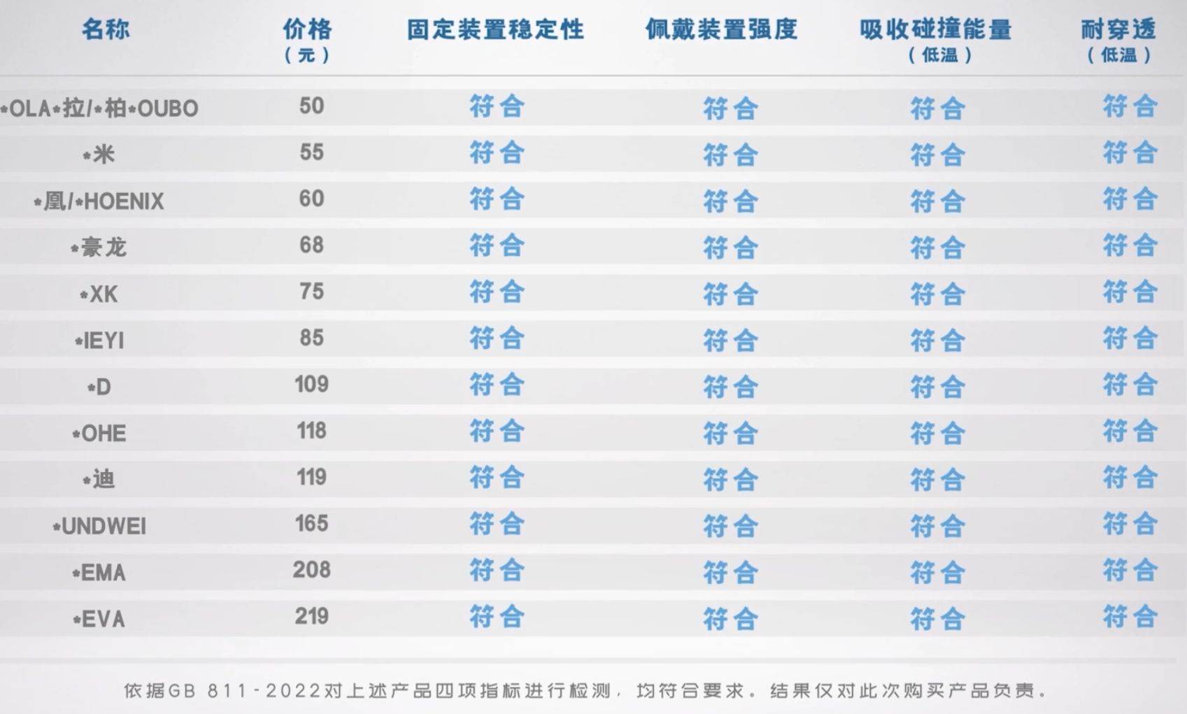 通過檢測,我們發(fā)現(xiàn)這12款頭盔均符合標(biāo)準(zhǔn)相關(guān)要求。其中*凰/*HOENIX、*UNDWEI這兩款頭盔分別在佩戴裝置強度和吸收碰撞能量方面表現(xiàn)更加突出,*OLA*拉/*柏*OUBO這款頭盔在性價比和均衡性上更突出。