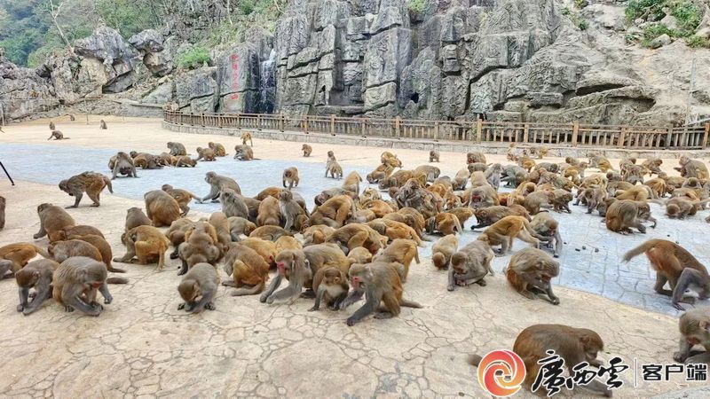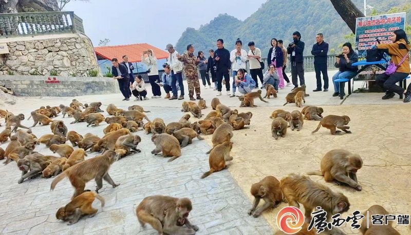 11月22日,“新興河池 綠動文旅——全國主流新媒體看河池大型采訪活動”采訪團到巴臘猴山景區進行探訪。“哈哈哈,它們好可愛啊!”走到喂猴場,讓大家首先忍俊不禁的是,上百只大大小小的獼猴在景區主管韋述鈞的指揮下,竟然像模像樣地列隊歡迎遠道而來的客人。未能上場的一些獼猴,或坐或蹲在附近的山林里,好奇地“圍觀”著來人。更讓大家驚喜的是,壯碩的猴王也拋頭露面。“它平時不怎么愿意下山,今天你們算是比較幸運地看到了王者尊容。”韋述鈞打趣道。隨著他拋撒出一把大米,廣場上的獼猴群隊形大亂,山上更多的獼猴也紛紛沖下山來,一起爭相搶食。搶不到大米的獼猴,急得抓耳撓腮……它們可愛的舉動,把采訪團成員們逗樂個不停。大家紛紛拿起相機或手機拍照,或與猴子們開展親密互動。“這是一幅人與自然和諧共生的美好畫面。”人民網記者何寧感慨地說道。
