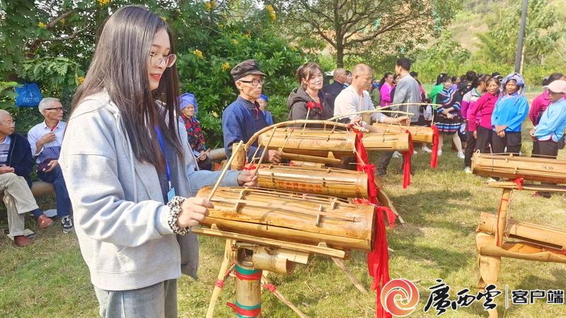 采訪團(tuán)成員感受非遺“筒噔”演奏。記者 覃錚 攝