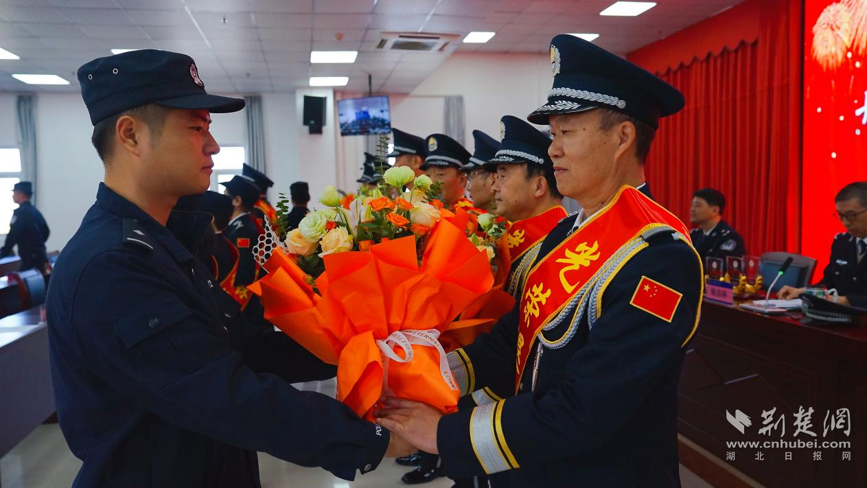 新錄民警為榮休民警獻(xiàn)上鮮花。通訊員供圖