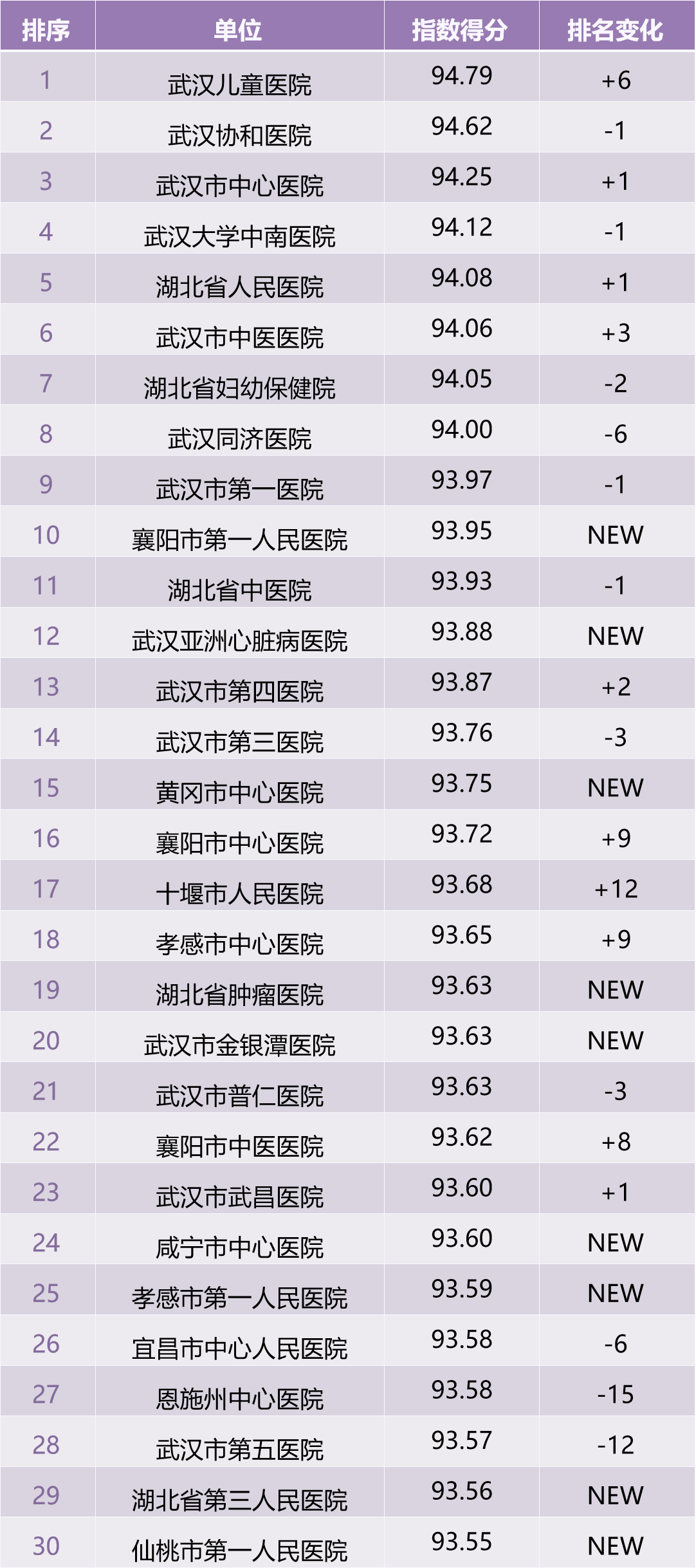 10月,武漢兒童醫院、武漢協和醫院、武漢市中心醫院位列本期榜單前三。排名前十的醫院中,武漢兒童醫院本月進步6位,躍居榜單首位,武漢市中心醫院進步1位排名第三,湖北省人民醫院進步1位排名第五,武漢市中醫醫院進步3位排名第六,襄陽市第一人民醫院新晉入榜,排名第十。進步幅度上,十堰市人民醫院進步12位,本月排名第十七,襄陽市中心醫院和孝感市中心醫院進步9位,分別排名第十六和第十八,襄陽市中醫醫院進步8位,排名第二十二。新晉入榜醫院方面,除襄陽市第一人民醫院外,武漢亞洲心臟病醫院、黃岡市中心醫院、湖北省腫瘤醫院、武漢市金銀潭醫院、咸寧市中心醫院、孝感市第一人民醫院、湖北省第三人民醫院、仙桃市第一人民醫院等本月均進入前三十。溯源發現,本月各醫院普遍加大宣傳工作力度,宣傳稿件無論在數量還是質量上均有顯著提升,整體指數得分相較9月提升了0.5分左右。
