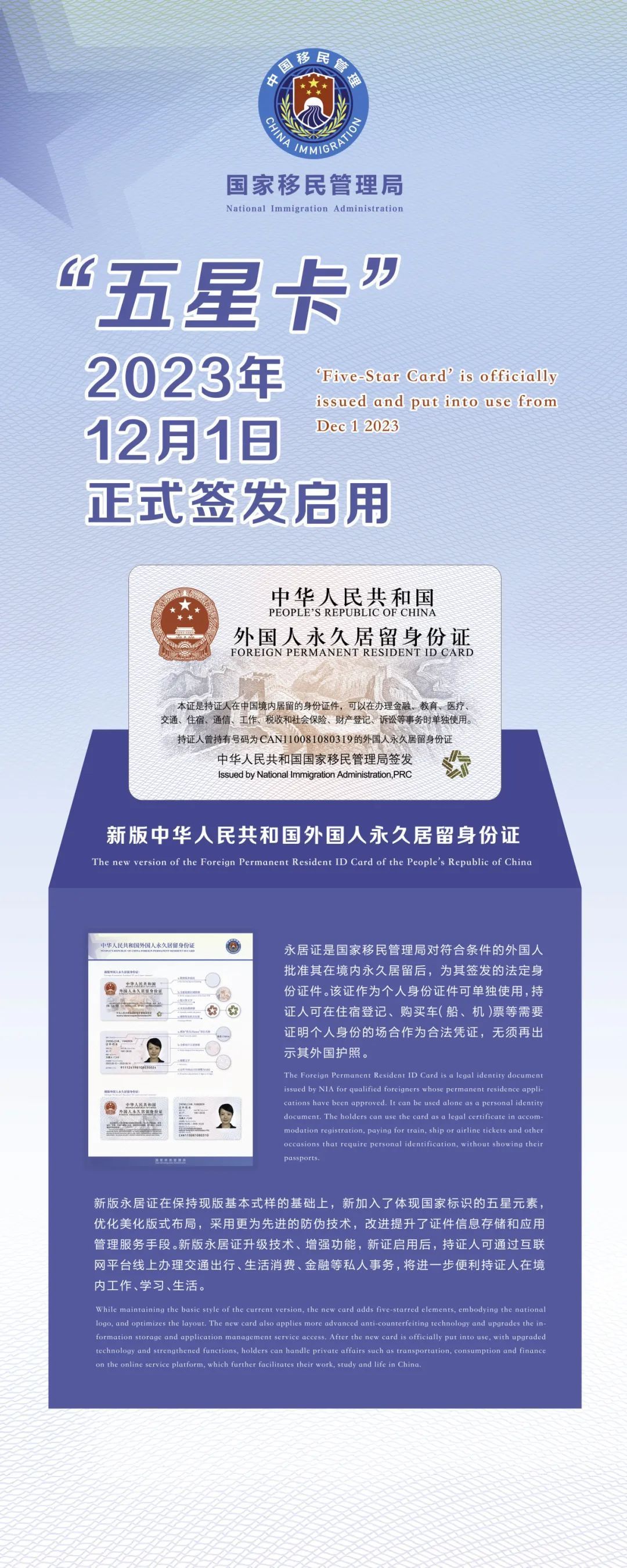 新版中華人民共和國外國人永久居留身份證12月1日正式簽發啟用。因加入了體現國家標識的五星元素,新版永居證被稱為“五星卡”。首日共有50名取得在華永久居留資格的外國人領取到了首批“五星卡”。他們來自美國、德國、英國、法國、俄羅斯、瑞典、新加坡、韓國等二十余個國家,均為在經濟、教育、科技、文化、衛生等多個領域為中國經濟社會發展做出了突出貢獻人員,當中包括中國政府友誼獎獲得者,在華長期任職工作的外籍高層次管理和專業技術人員,在重點院校、科研機構長期從事教學科研的外籍教授學者等。當天,在北京、天津、上海、廣東等地公安機關出入境辦證窗口,還有不少永久居留外國人前來咨詢申請換發“五星卡”。