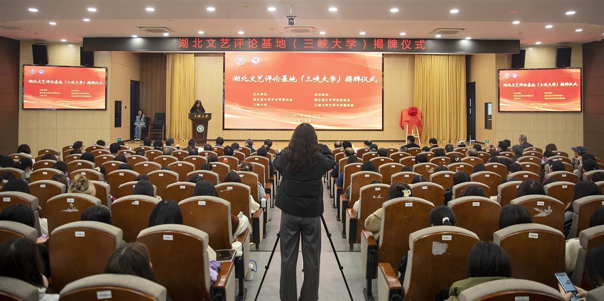 11月29日上午,湖北文藝評論基地(三峽大學)揭牌儀式在三峽大學長江報告廳隆重舉行。中國文藝評論家協會主席夏潮,湖北省文聯黨組書記、常務副主席張士軍,三峽大學黨委書記何偉軍,中國文藝評論家協會副主席、中國文藝評論家協會視聽藝術委員會主任張德祥,湖北省文聯副主席、湖北省文藝評論家協會主席、武漢大學文學院教授李遇春,湖北省文聯二級巡視員、湖北省文藝評論家協會駐會副主席李建華,湖北省電影家協會副主席、三峽大學學術委員會副主任吳衛華,湖北省文藝評論家協會副主席、三峽大學文傳學院院長劉波以及中國文藝評論家協會視聽藝術委員會的專家學者、湖北文藝評論基地(中南民族大學、湖北民族大學)負責人等出席揭牌儀式。湖北省文聯黨組成員、副主席李悅主持揭牌儀式。