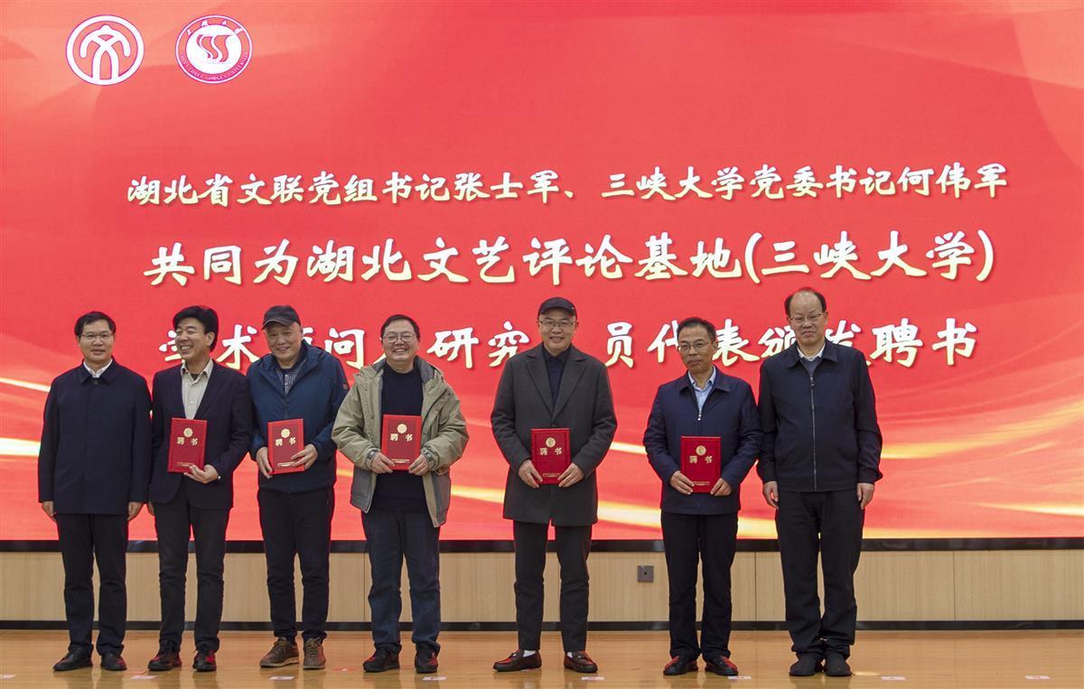 湖北省文聯黨組書記、常務副主席張士軍,三峽大學黨委書記何偉軍共同為基地學術顧問頒發聘書