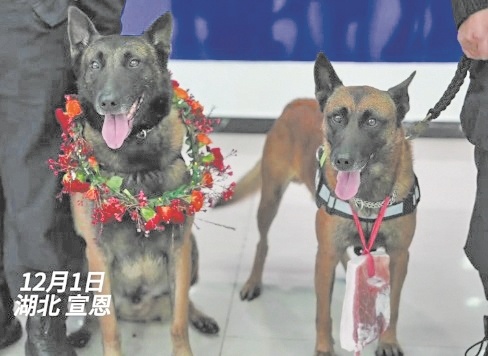 據了解,警犬“凱迪”5歲,“皮卡”4歲,均屬馬犬科,自加入宣恩縣公安局特警大隊警犬中隊以來,已經成功參與搜救走失人員50余起。此次搜救成功,訓犬員向參與搜救的警犬發放了榮譽花環和五花肉作為獎勵。