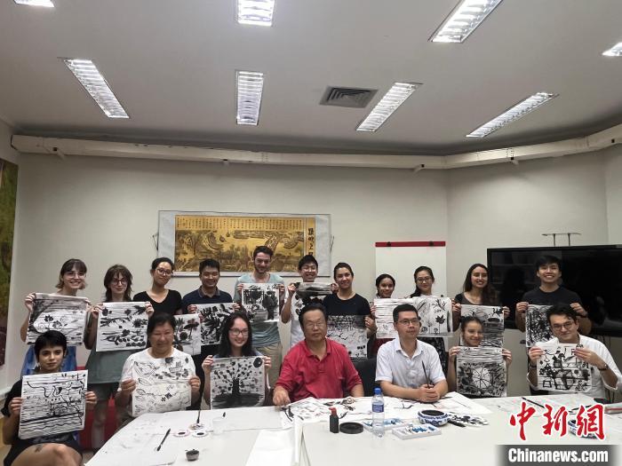 日前,湖北大學(xué)藝術(shù)學(xué)院譚崇正、鄧鴻濤兩位書畫名家走進(jìn)圣保羅州立大學(xué)孔院及當(dāng)?shù)囟嗨⑿W(xué),開展水墨畫工作坊。圖為水墨畫教學(xué)現(xiàn)場。中新社記者林春茵攝